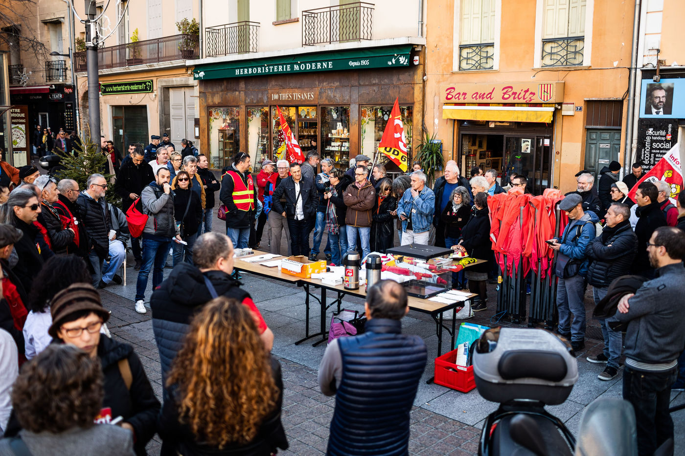 Rassemblement devant la permanence du depute La République En Marche - LREM de Perpignan, en Centre Ville, par les grevistes cheminots, les manifestants opposés à la réforme des retraites menée par le gouvernement Macron et les gilets jaunes.