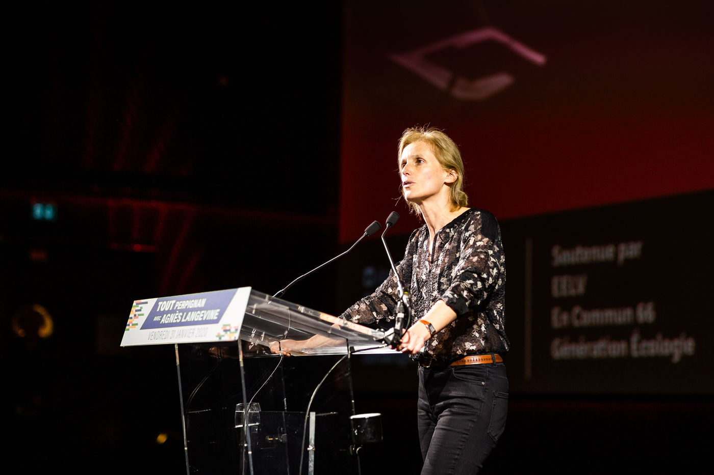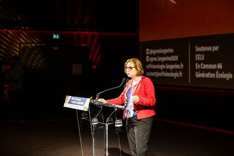 Environ 600 personnes etaient présentes au cinéma Le Méga Castillet, pour soutenir le campagne électorale d'Agnès Langevine pour la mairie de Perpignan, sous l'étiquette Europe Ecologie Les Verts et le slogan : "Enfin l'Ecologie".