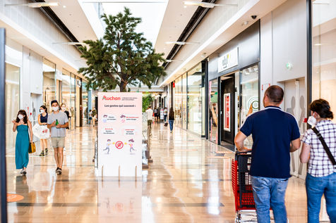 Perpignan, Centre Commercial Auchan, Mai 2020. Visite d'un hypermarché et de sa galerie marchande en période de déconfinement.