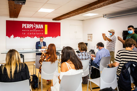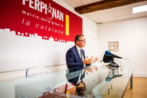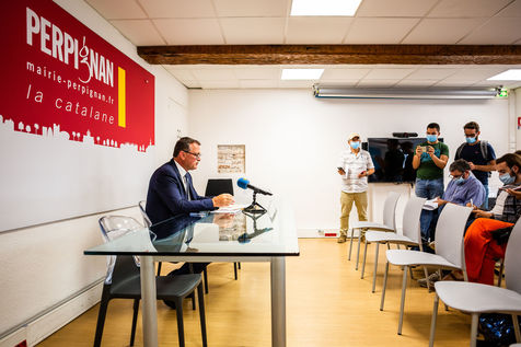 Perpignan, 15 septembre 2020, Conférence de presse de Louis Aliot, maire RN de Perpignan, suite à une course poursuite entre un homme armé d'une kalashnikov et les forces de l'ordre, elles aussi armes au poingt, devant 2 écoles primaire du centre-ville, rapidement fermées et sécurisés, à l'heure de pointe de la rentrée des élèves (lundi 14 septembre 2020 à 8h20/8h30).