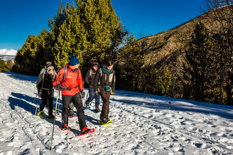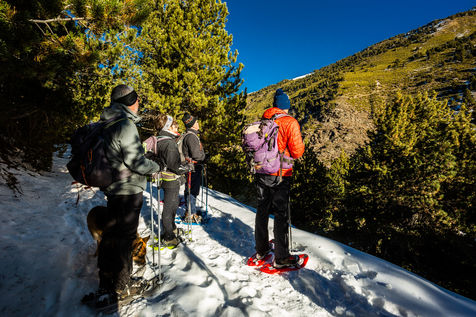 Massif du Puigmal (66), January 2021, snowshoe hiking on the trail of winter fauna, in Cerdanya, with Christophe, guide of the Ozone group, between the old ski resort of Puigmal (commune of Err) and the Mata hut.