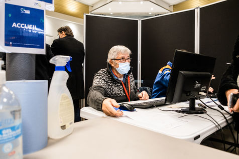 Castres, 7 décembre 2021, vaccinodrome départemental, dans un des départements les plus vaccinés chez les 65 ans et plus, la campagne de rappel ou 3eme dose de vaccin se poursuit malgré un nombre de place largement inférieur aux attentes de la population et bien inférieure aux moyens mis en place lors des campagnes des 1ere et 2eme dose de vaccins pfizer comme moderna.