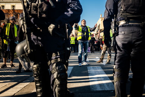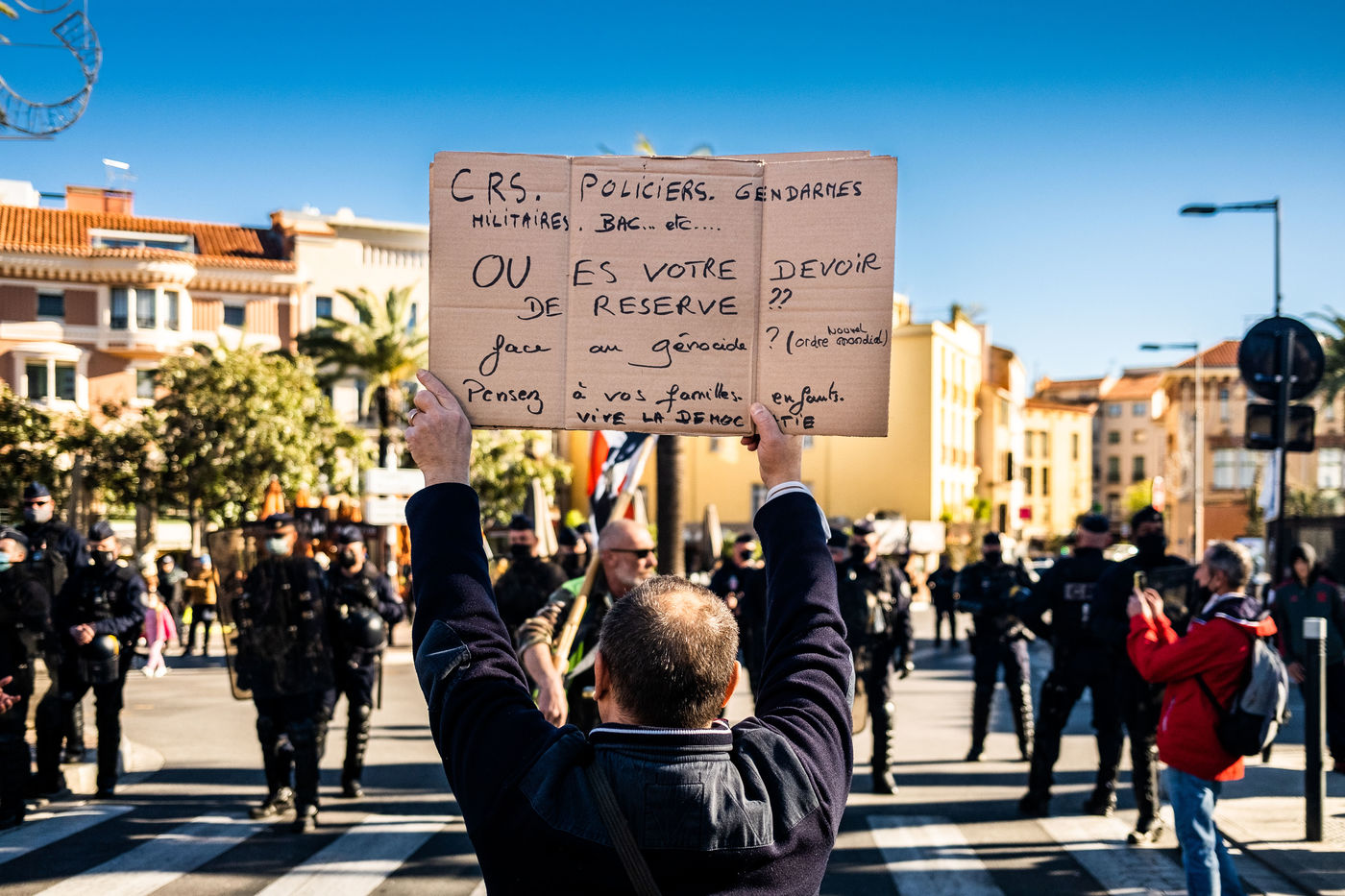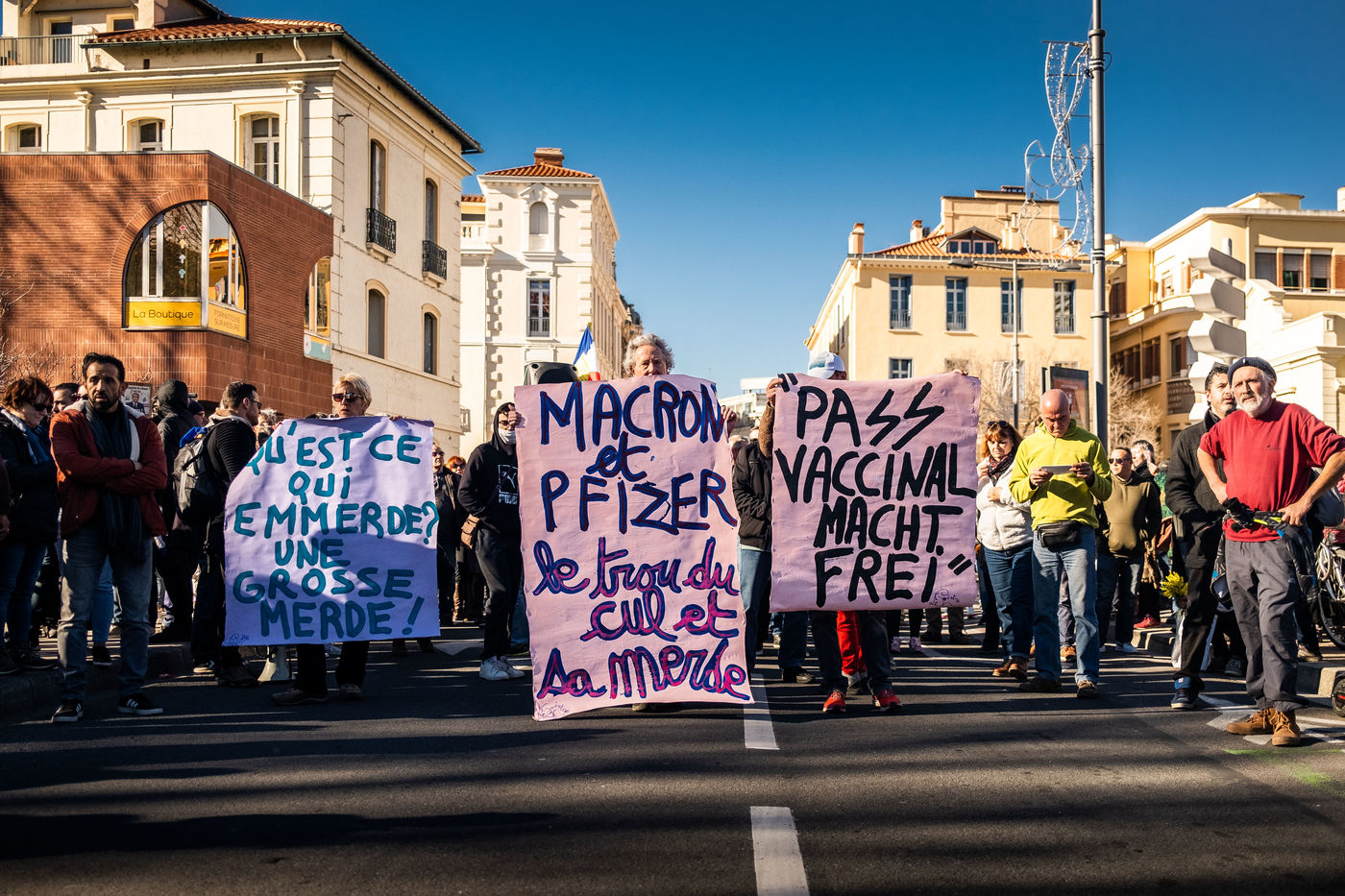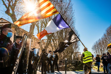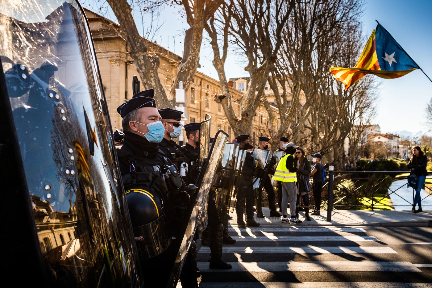 Perpignan, 29 janvier 2022, Manifestation Anti Pass Vaccinal hebdomadaire bloquée par une compagnie de CRS envoyé par la préfecture pour les empêcher d'accéder au Tribunal de la commune où comparaissent 3 manifestants ayant agressé le député Romain Grau lors de la manifestation de la semaine précédente...