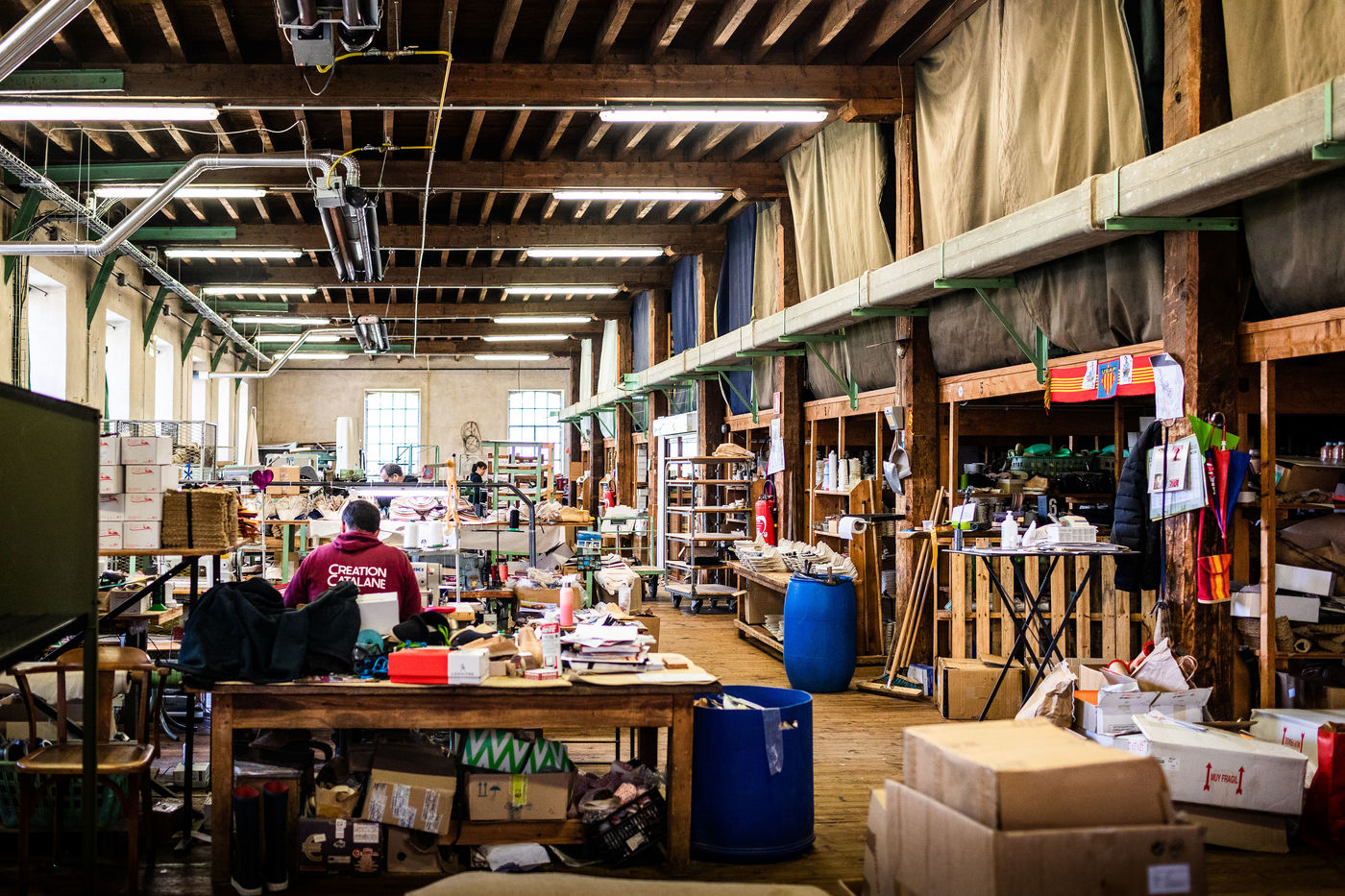 Saint Laurent de Cerdans, atelier Création Catalane, Avril 2022, Retour de l'espadrille et de la Vigatana catalane, sur ces terres, dans l'atelier qui a vu naitre et prospérer l'économie de la chaussure historique et traditionnelle de l'Est des Pyrénées.