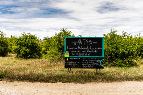 Argelès sur Mer, Domaine de la Mer Blanche, 8 juin 2023, afin de faire face au changement climatique, à la secheresse en cours dans les Pyrénées-Orientales et dans une démarche d'agroforesterie bio et environnementale, le domaine arboricole de Frederic Bey, s'est spécialisé dans les figuiers de barbarie, grenade, et agrumes. Fruits vendus à la pièce ou transformés en liqueur, jus et confiture.