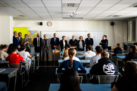 Temps, en classe, avec le professeur, les eleves mais aussi en présence du Maire de Perpignan, Louis Aliot, du Préfet des Pyrénées Orientales, Thierry Bonnier et de la directrice du rectorat et DSDEN du département.