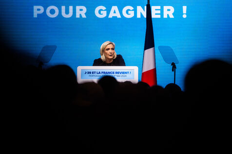 Perpignan, 1 May 2024, As part of its campaign for the European elections on 9 June 2024, the Rassemblement National led by Jordan Bardella and Marine Le Pen is holding its meeting in Perpignan, the home town of Louis Aliot, the city's RN mayor.