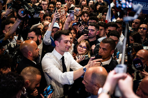 Perpignan, 1er Mai 2024, Dans le cadre de sa campagne pour les elections europeennes du 9 juin 2024, le Rassemblement National mene par Jordan Bardella et Marine Le Pen tient son meeting a Perpignan, ville de Louis Aliot, maire RN de la ville.