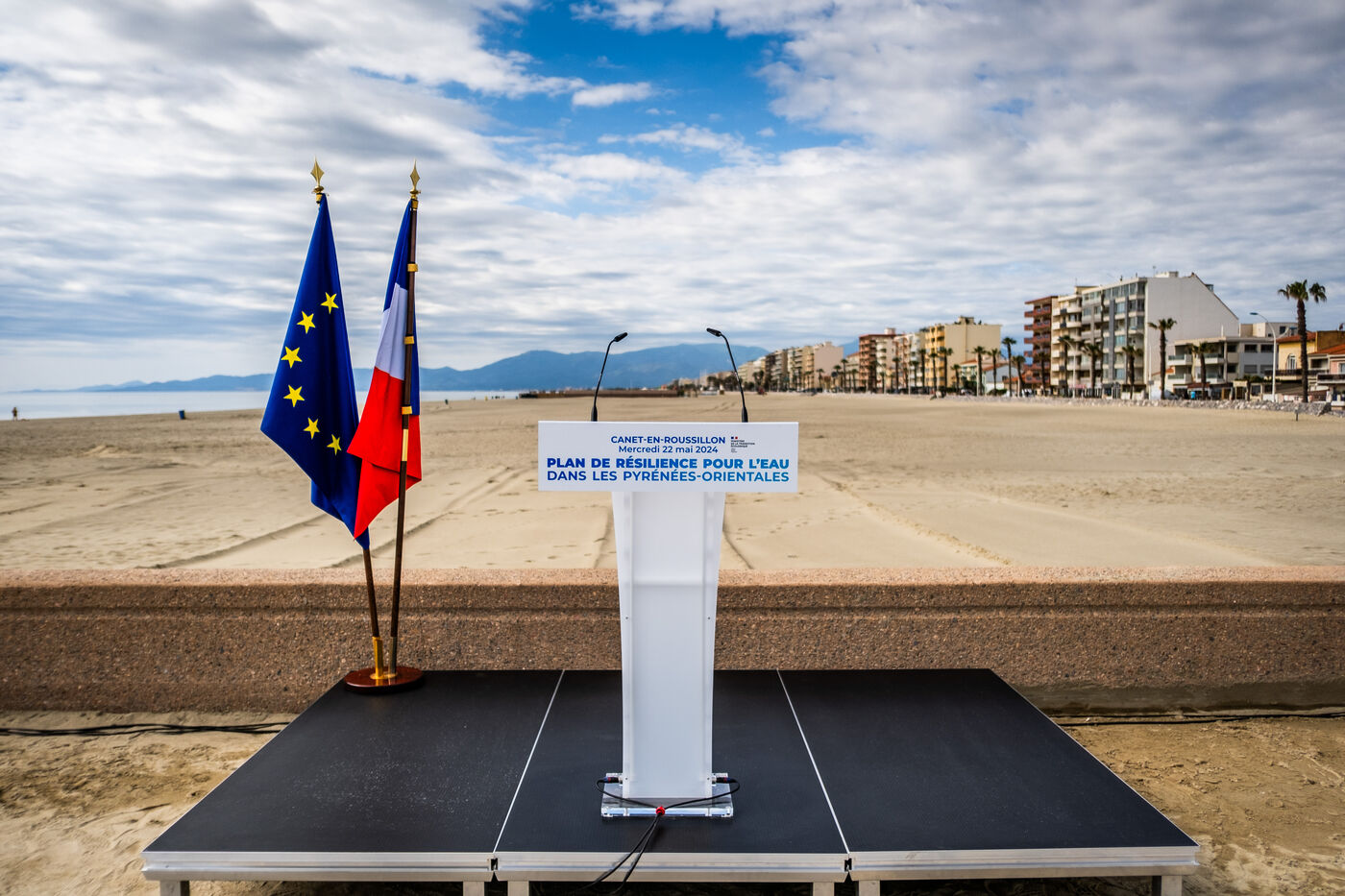 Canet, Pyrenees-Orientales, 22 May 2024, Visit from Christophe Bechu, Minister for Ecological Transition, as part of the presentation of the resilience plan for water in the Pyrenees-Orientales, a department severely affected by drought over the last 2 years.