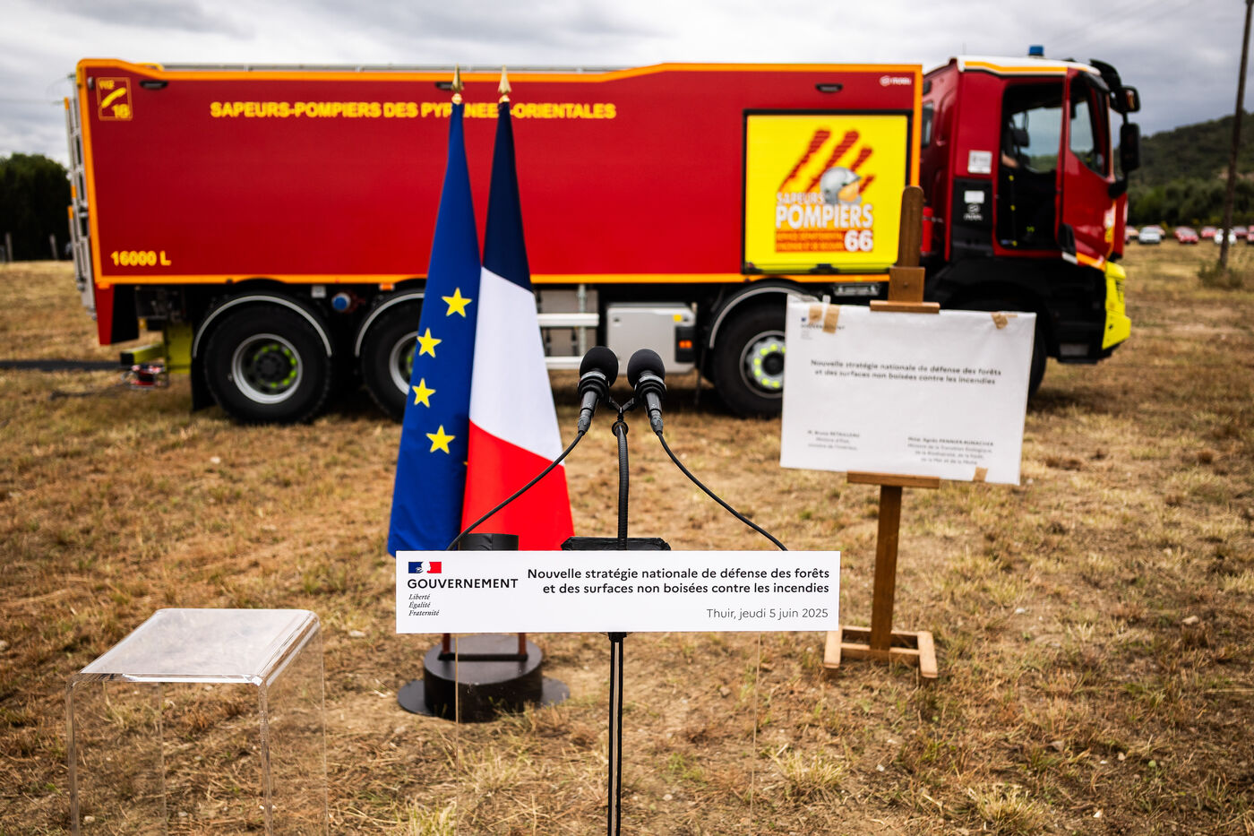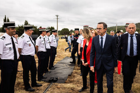 Camelas (66), June 5, 2025, as summer approaches and as part of the launch of the Stratégie nationale de défense des forêts contre les incendies, Bruno Retailleau, Minister of the Interior, and Agnès Pannier-Runacher, Minister of Ecological Transition, Biodiversity and Forestry, visited the Pyrénées-Orientales region, where they were given a demonstration of the resources deployed for the coming summer season, before meeting with DFCI (Defense de la Forêt contre les Incendies) officers from SDIS 66 (fire department) and ONF (National Forestry Commission).