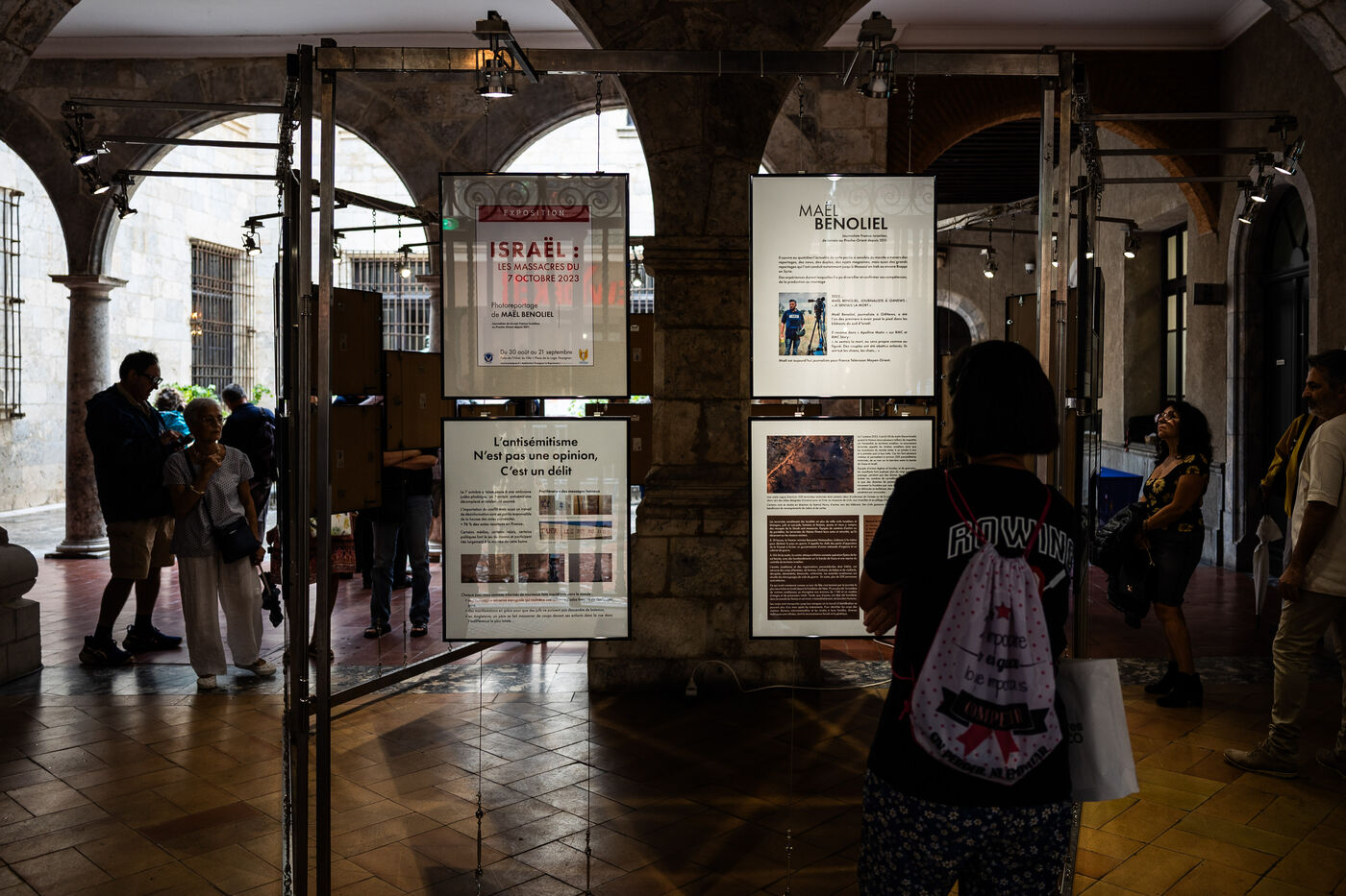 Perpignan, 29 aout 2025, profitant du lancement de la 37eme édition du festival international du photojournalisme Visa pour l'Image, la mairie de Perpignan sous l'impulsion de son maire, vice-président du RN (Rassemblement National), Louis Aliot, présente une exposition - hors festival - dans le patio de l'hotel de ville sur les massacres du 7 octobre 2023 en Israël.
