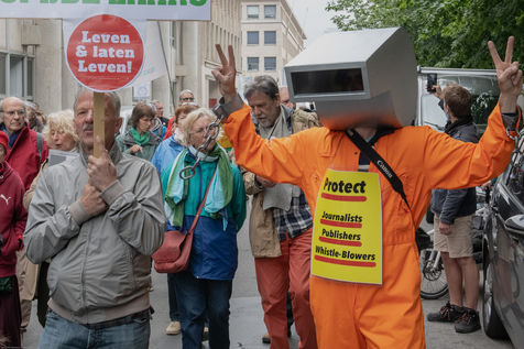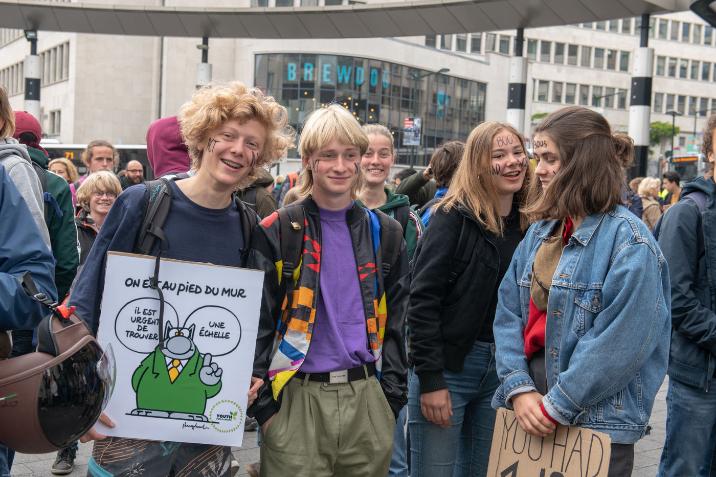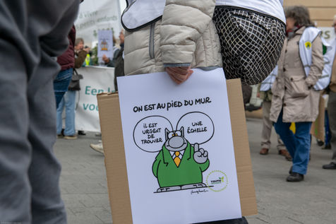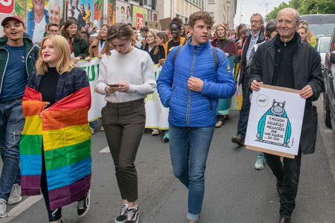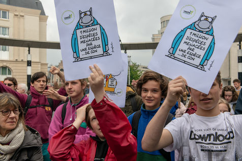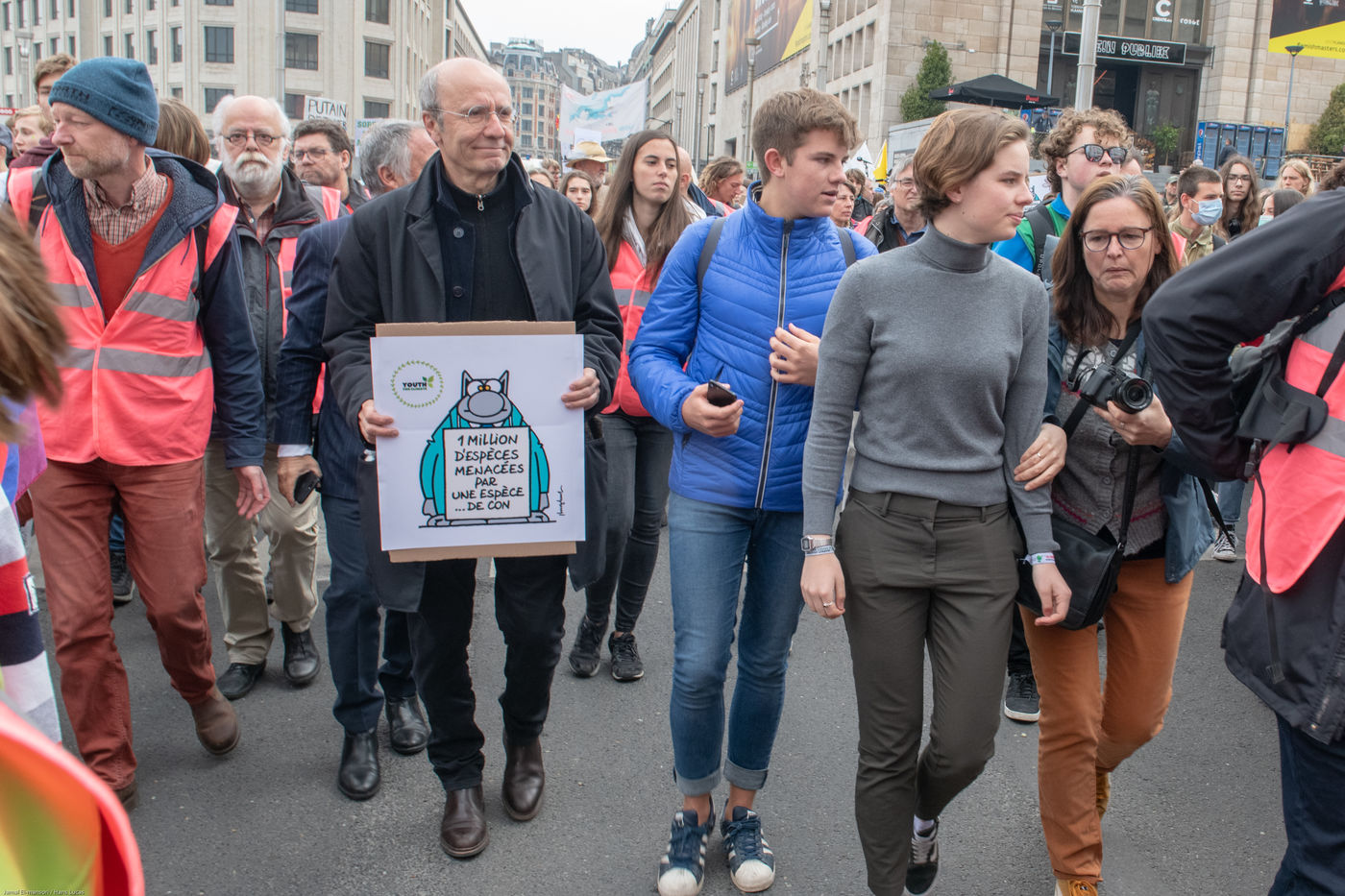 Philippe Geluck. Apportant son soutien au mouvement des jeunes, il a été présent du début à la fin de la manifestation, portant son propre dessin,
