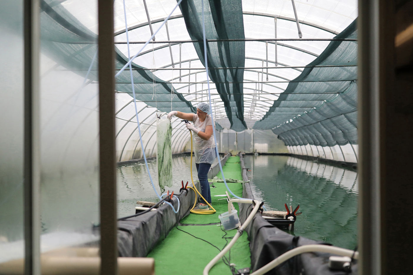 Sa silhouette, penchée sur un bassin sous serre, évoque celle d?un paludier récoltant le sel des marrés-salants. « Au départ, nous nous sommes procurés 60 kilos de biomasse auprès d?un collègue, pour l?ensemencer dans nos bassins. La spiruline a végété pour coloniser tout l?espace. Lorsqu?elle est suffisamment concentrée, nous la récoltons et elle colonise alors à nouveau les bassins » explique la jeune femme de 30 ans en terminant sa récolte. Chaque matin, le même processus : transférée dans un filtre, la spiruline est captée pour finir sa course dans un bac, quand l?eau continue son parcours pour revenir au bassin. Une fois pressée, la spiruline forme une sorte de pâte à modeler, que Suzanne découpe, à l?aide d?un poussoir à saucisse réhabilité pour l?occasion, en spaghettis. Ils sèchent une nuit entière, à 40°C, puis sont envoyés en laboratoire pour des analyses bactériologiques, avant d'être mis en sachet, sous forme de paillettes, prêtes à la commercialisation.