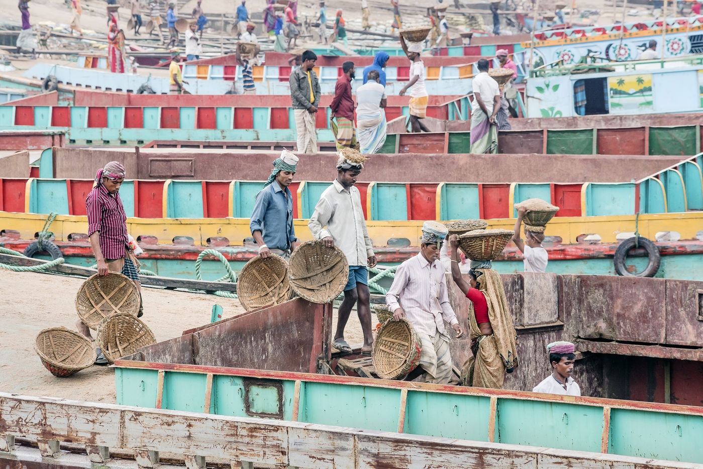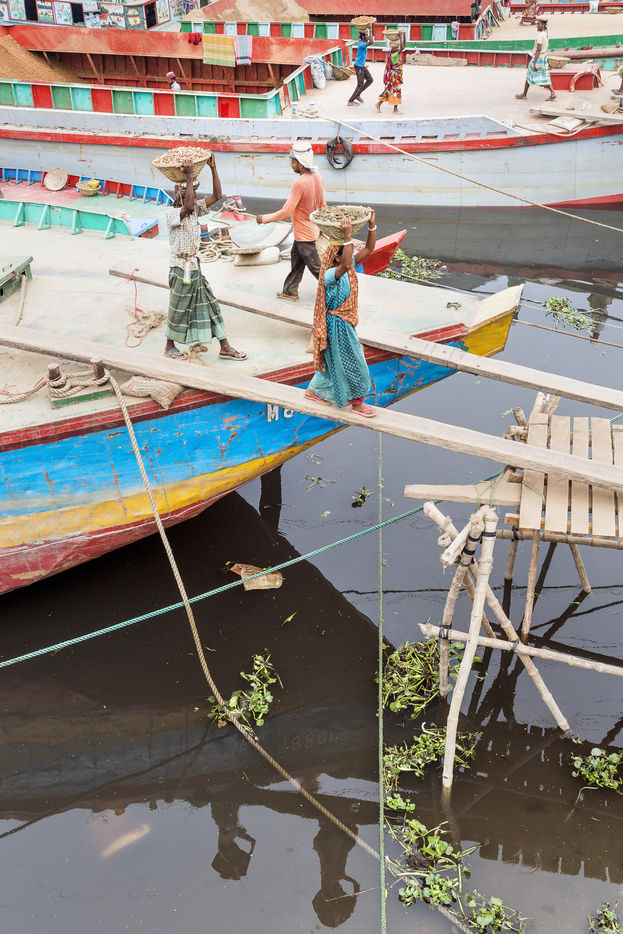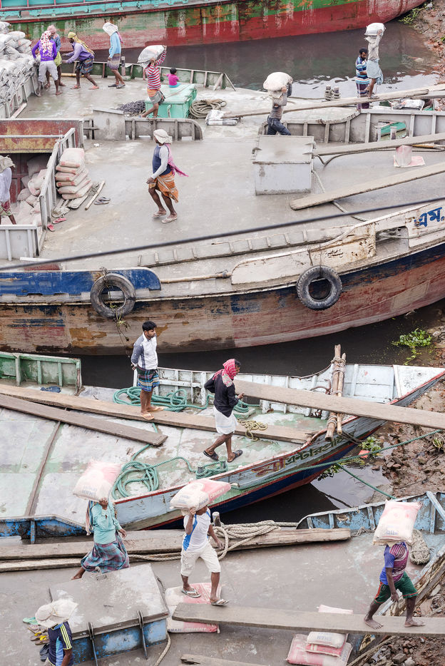 Dans le port de Gabtoli, en périphérie de Dhaka, des milliers de travailleurs journaliers arrachent aux ventres des bateaux des montagnes de sable, graviers, ciment, briques et charbon.