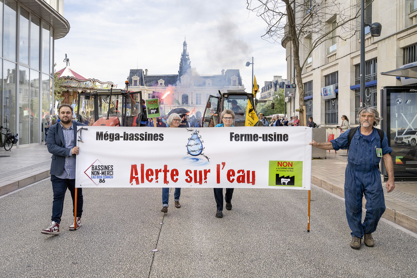 In Poitiers, several hundred protesters came to express their refusal of the creation of giant water reserves and a factory farm to be used for the fattening of 1200 bullocks.