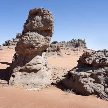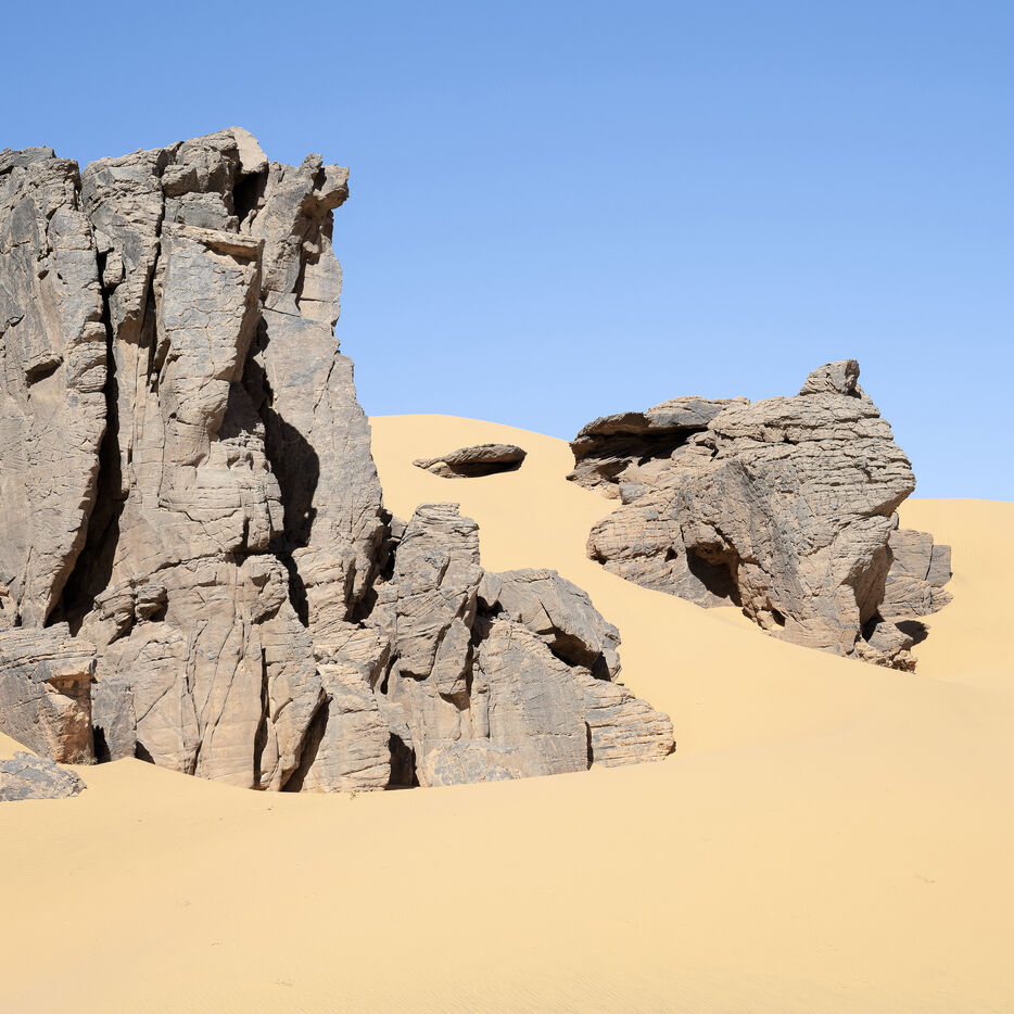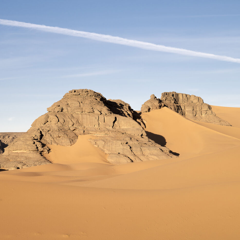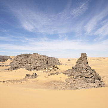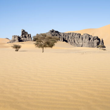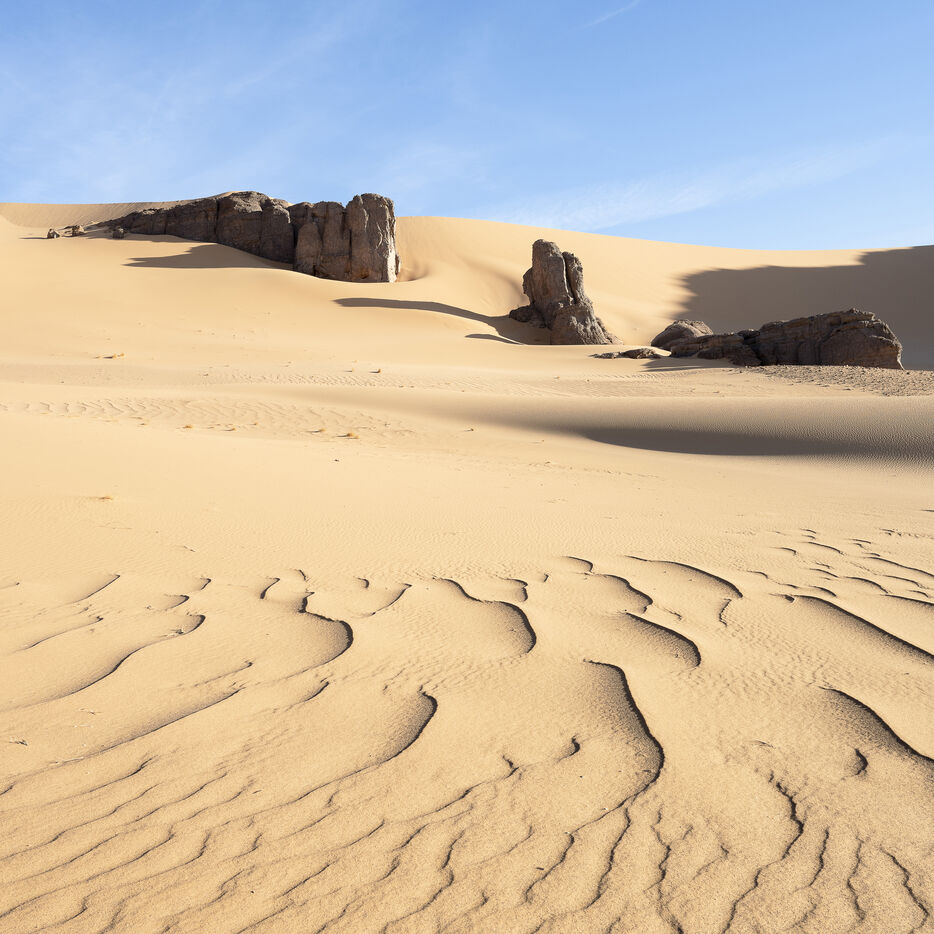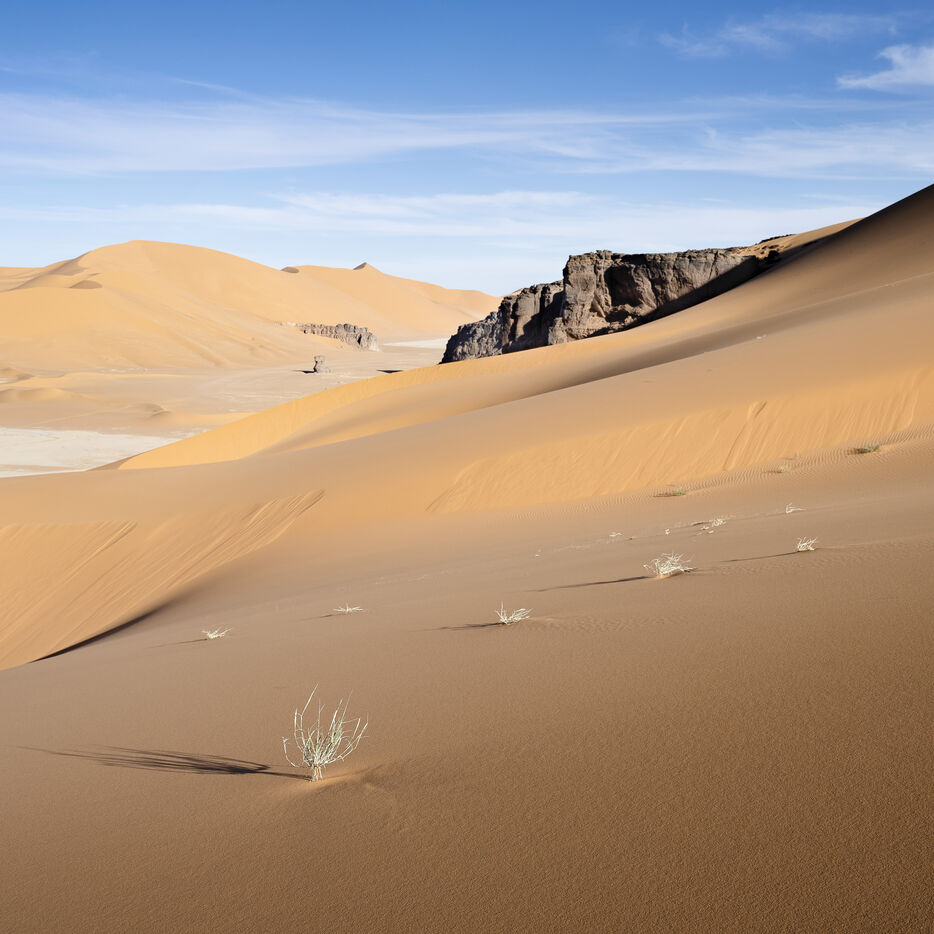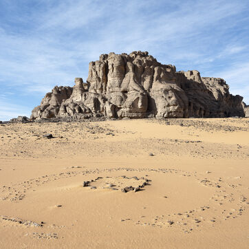 There are no permanent water points in this area of several hundred square kilometers, preventing anyone from settling there. The Algerian government has drilled there but never found any water. Yet rainfall can be torrential, as evidenced by the wide beds of some of the wadis, the whitish sediments that line their bottoms and the shrubs and bushes that struggle to grow. The water surges for a few hours, a few days at most, before disappearing into the region's sandstone soil.