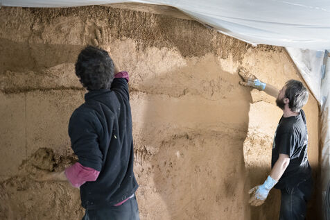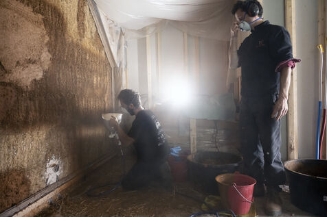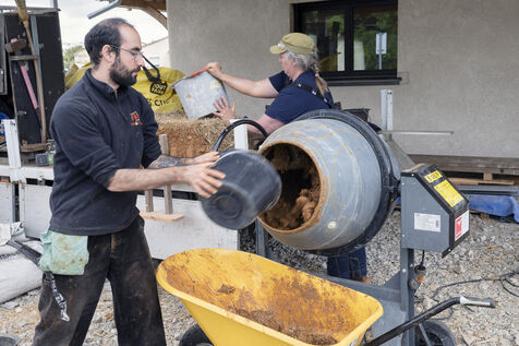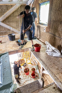 Pour diminuer le coût de leur construction, les propriétaires se réservent souvent certains travaux, effectués sous formes de chantiers participatifs où l'entraide est de mise. Ici on peut suivre quelques étapes de la construction de la maison d'Aurélien, co-fondateur de la Scop qui compte 9 associés. Le travail se fait entre amis et avec beaucoup de bonne humeur et de convivialité.