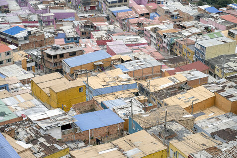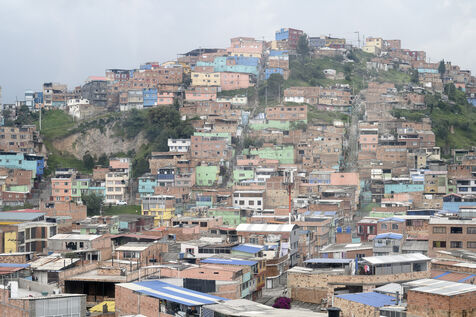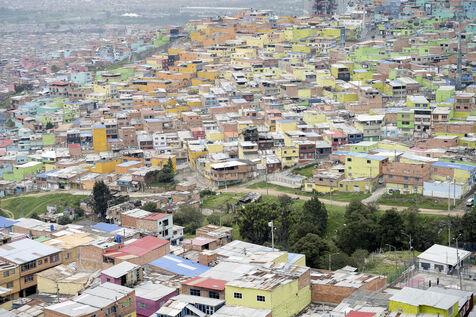 Lovée dans une vallée de la Cordillère des Andes, Bogota s'étire sur une trentaine de kilomètres. A sa périphérie les plus pauvres ont construit des bidonvilles qui escaladent les pentes escarpées des montagnes dont Ciudad Bolivar est un exemple de plus de 600 000 habitants.