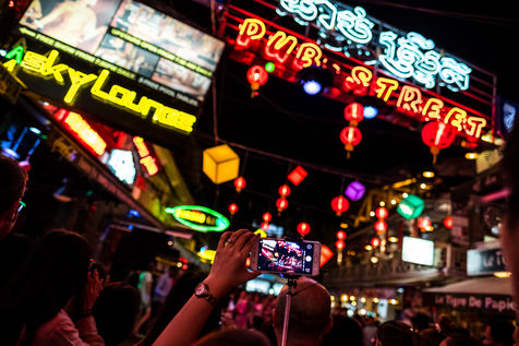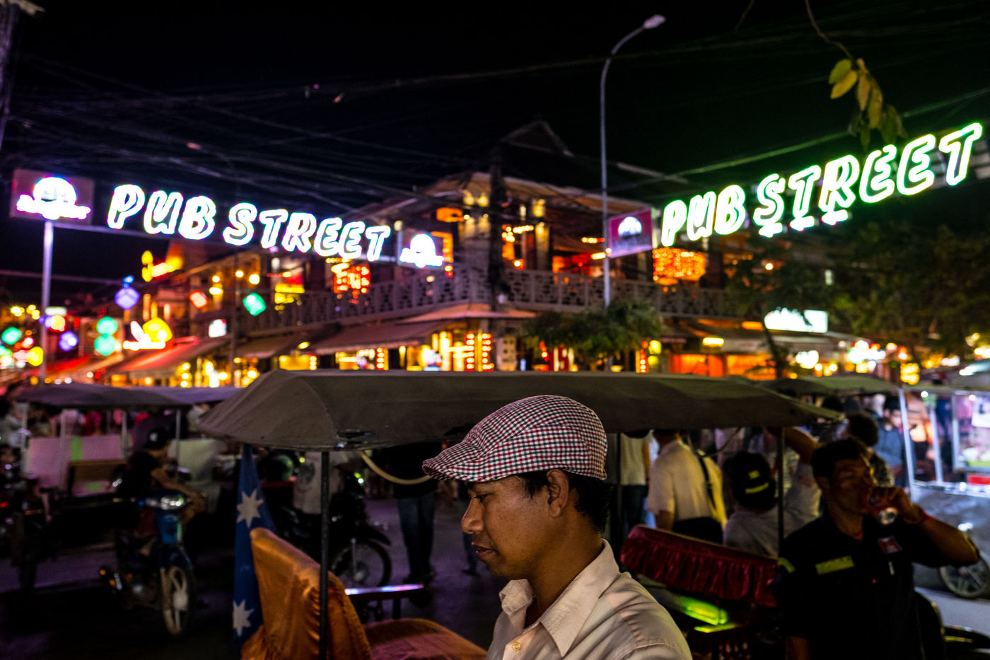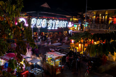 A Siem-Reap, la cité qui accueille les voyageurs et touristes de Angkor, le centre-ville a été complètement transformé pour devenir un royaume de la fête, dont l'artère principale « pub street » voit bars et restaurants courtiser les visiteurs d'un week-end.