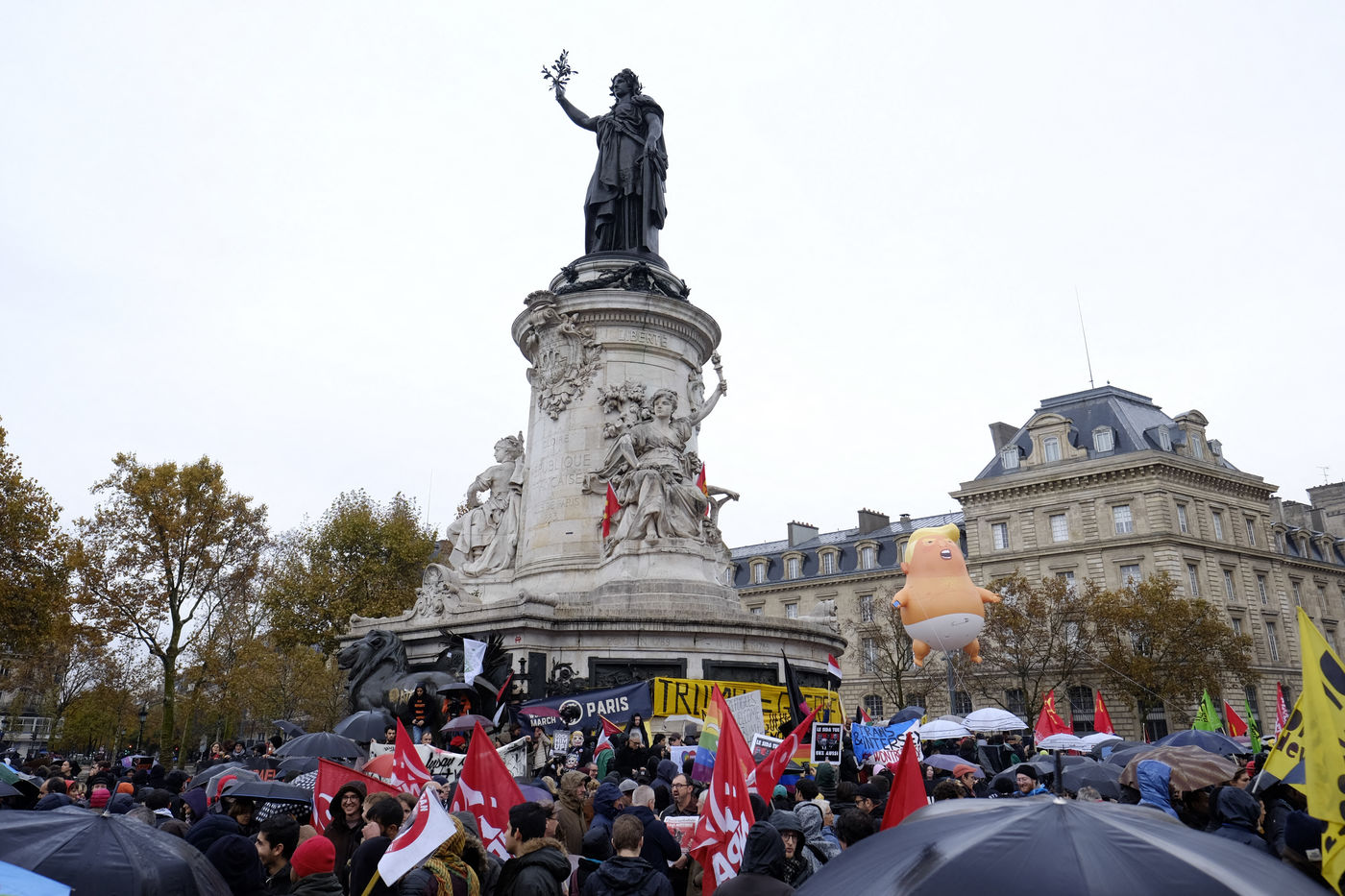 Lors de la journée commémorative du 11 novembre, 70 représentants de différents états se sont joints à Emmanuel Macron et ont pris part à la cérémonie qui s'est déroulée sous l'Arc de Triomphe. Dans l'après-midi, Place de la République, environ 1500 personnes se sont rassemblées pour s'unir principalement contre la venue de Trump.
