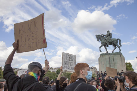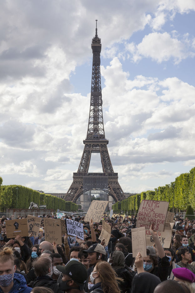 La foule menée par le mouvement Black Lives Matter s'est rassemblée au pied de la statue de Joffre sur le Champ de Mars. Tous réclament justice contre les violences policières en France comme aux USA. Paris, 06 juin 2020.