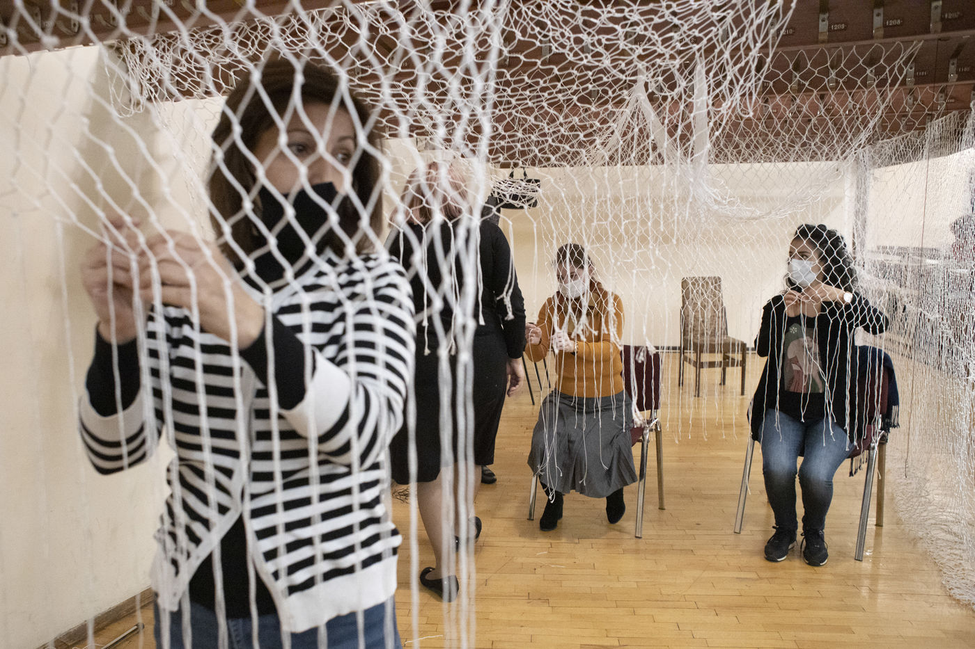 Afin de soutenir l'armée arménienne qui s'oppose à l'invasion de l'Azerbaïdjan en Artsakh, les membres de l'orchestre philharmonique de Yerevan tressent des filets de camouflage dans les vestiaires de l'Opéra. Yerevan, 06 novembre 2020.