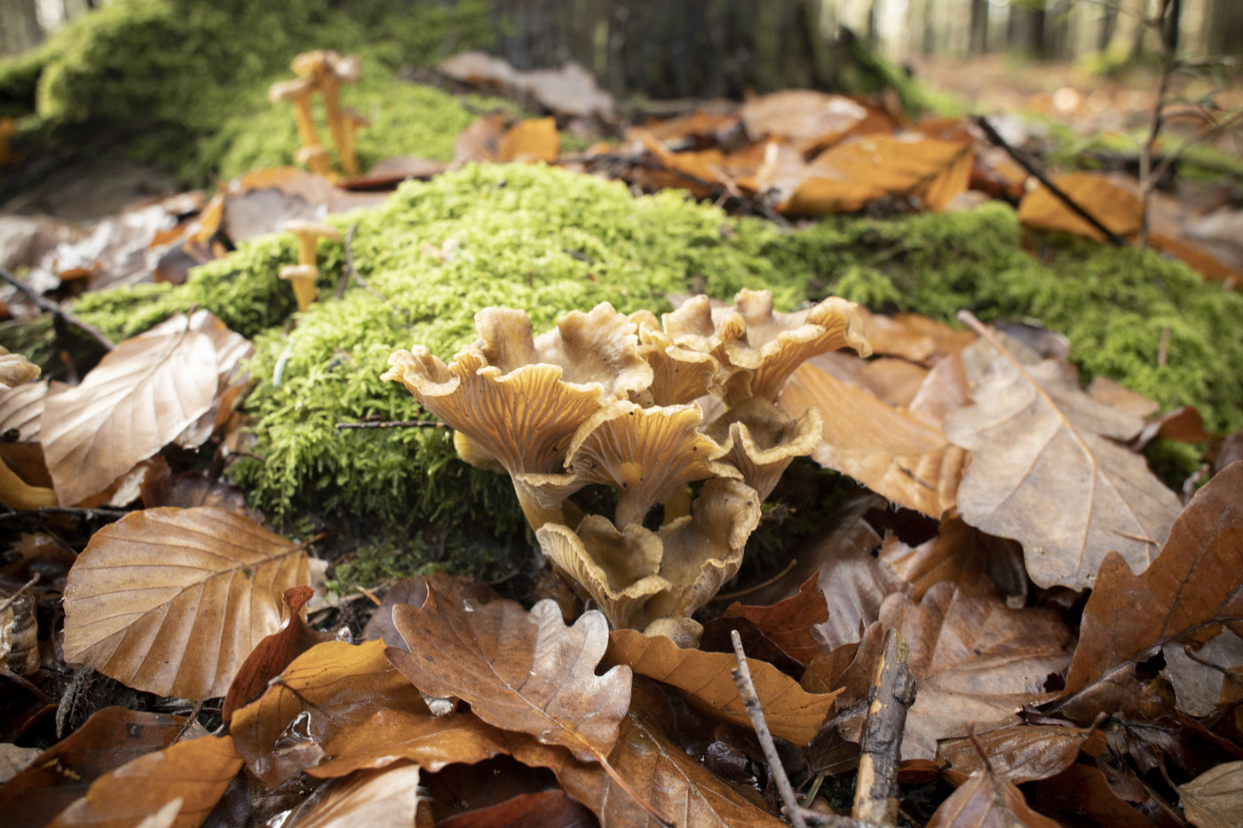 Chanterelles or oyster mushrooms (Pleurotus ostreatus) are among the last edible mushrooms of the fall.