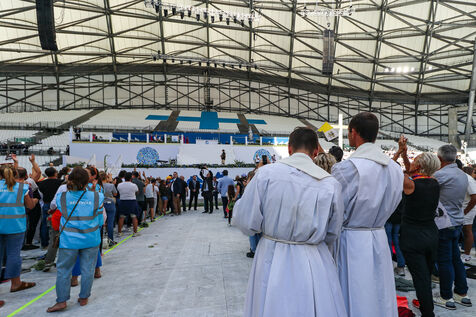 Le Pape François était présent pour célébrer une messe au stade Vélodrome. Premier Pape à revenir dans la ville de Marseille en 500 ans, la foule était nombreuse dehors. A l'interieur du stade, des dizaines de milliers de fidèles l'ont accueilli avec ferveur.