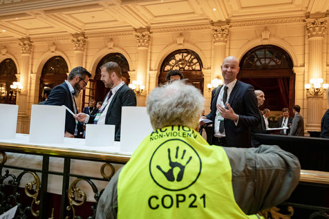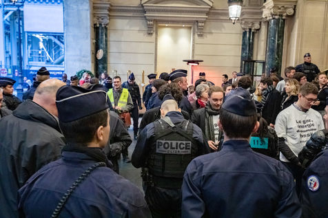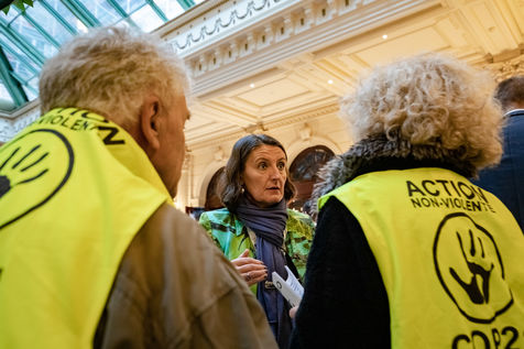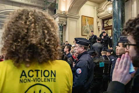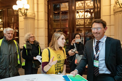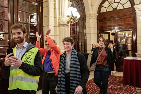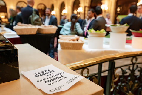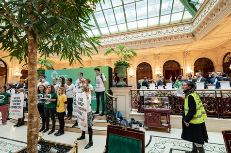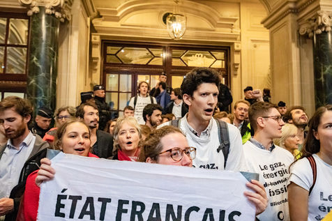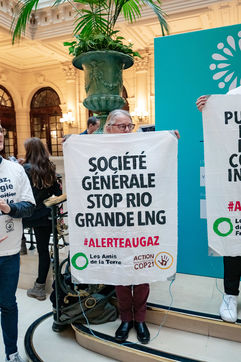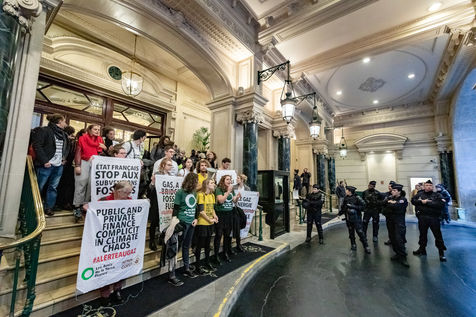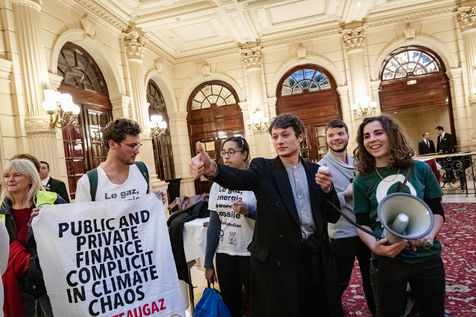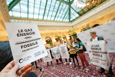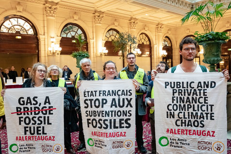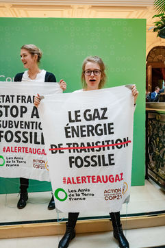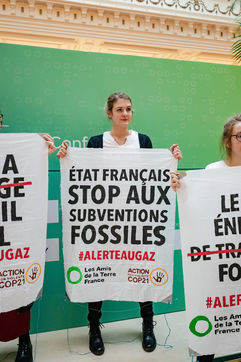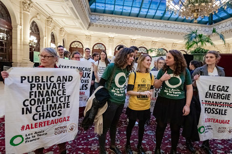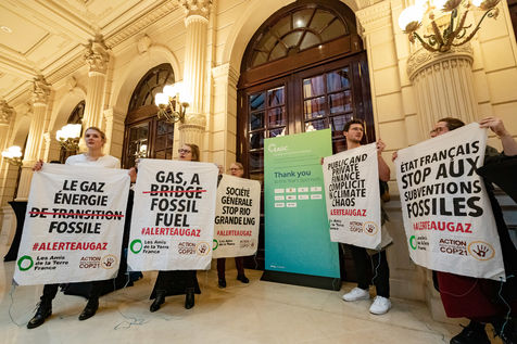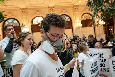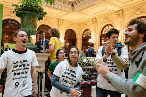 On Wednesday 6 November 2019 in Paris, 91 activists from Les Amis de la Terre and Action Non-Violente COP21 prevented the second day of the European Annual Gas Conference (EAGC), which brings together more than 300 representatives of French and European institutions, the gas industry, and its bankers including Société Générale. Activists call on public and private finance to end their massive support for gas to align with the goal of staying below 1.5°C of global warming.
