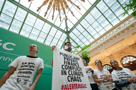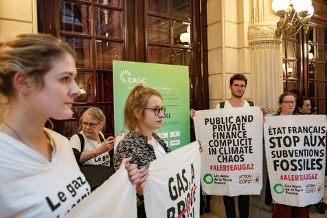 EAGC (European Annual Gas Conference) reunit plus de 300 representants des institutions francaises et europeennes, de l'industrie gaziere, et de ses banquiers dont Societe Generale. Les militants appellent la finance publique et privee a mettre fin a leurs soutiens massifs au gaz pour s'aligner avec l'objectif de rester sous 1,5 °C de rechauffement global.