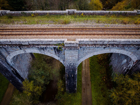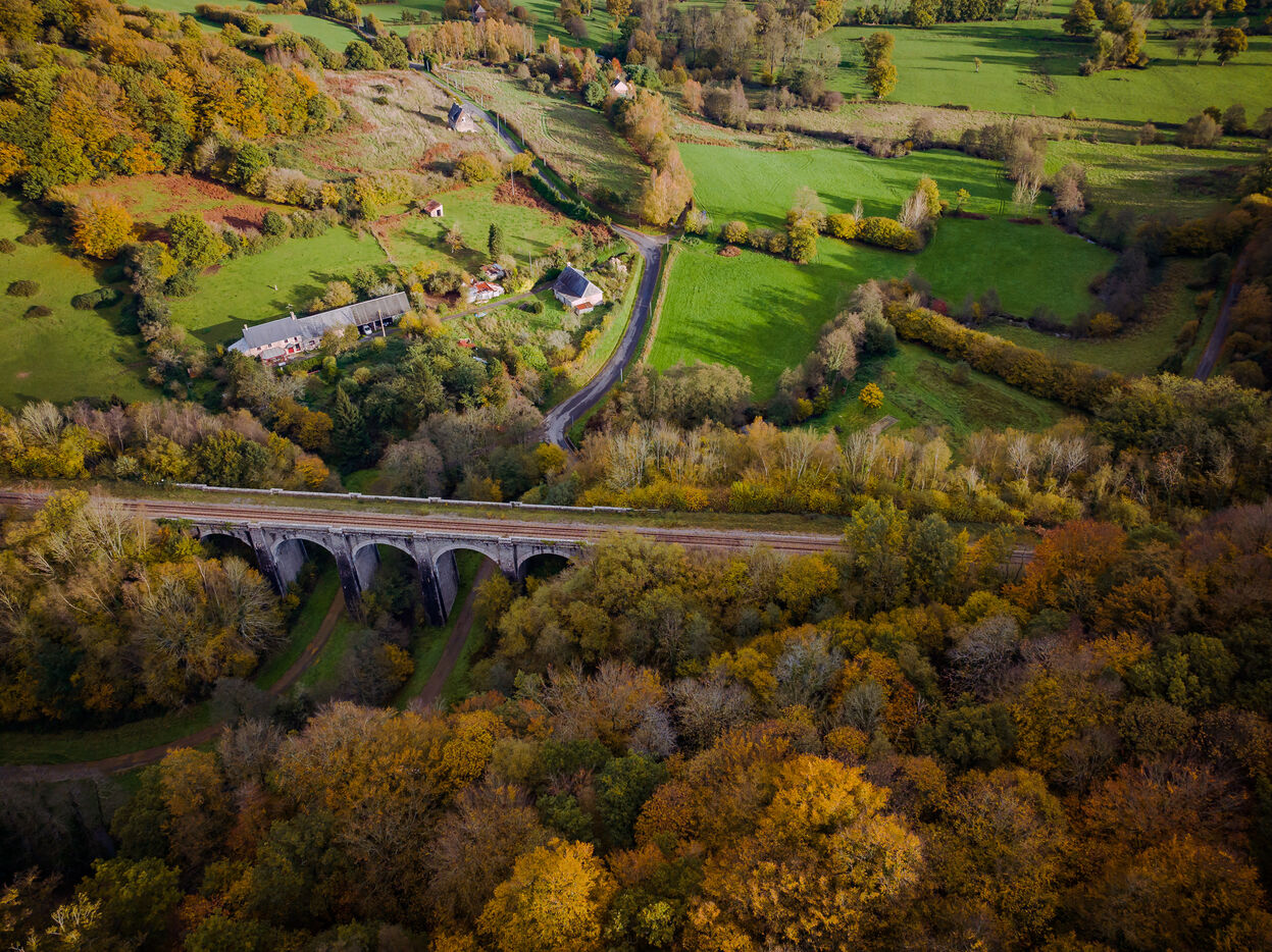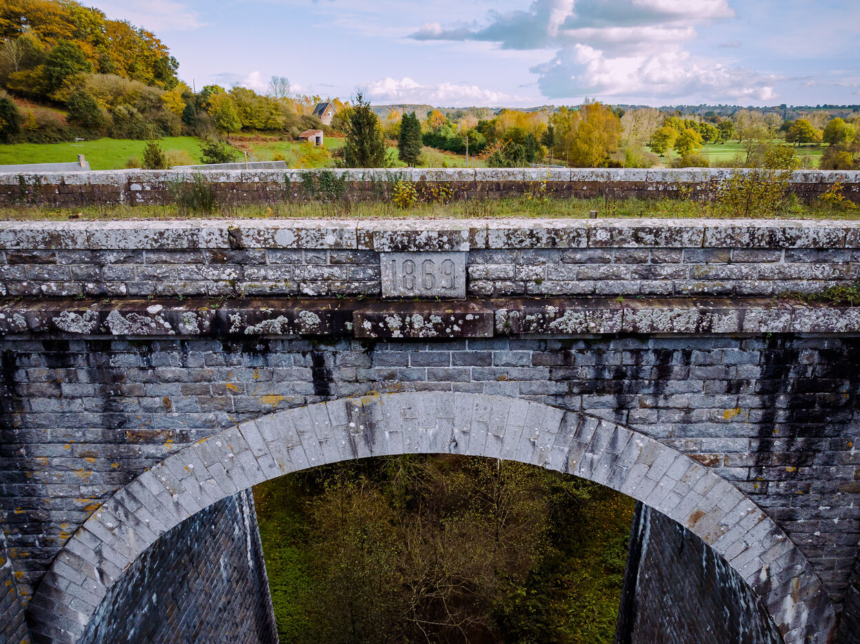 Built in 1869 by architect Marcel Delarbre under Napoleon III, to mark the opening of the Paris-Granville railway line. Its construction uses wooden hangers and corbelled bases to support the hangers. The latter disappeared when the structure was repaired. It is 98.5 m long and 22.5 m high, spanning the Airou Valley.