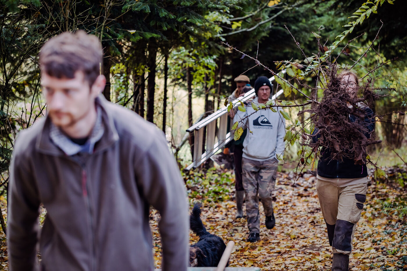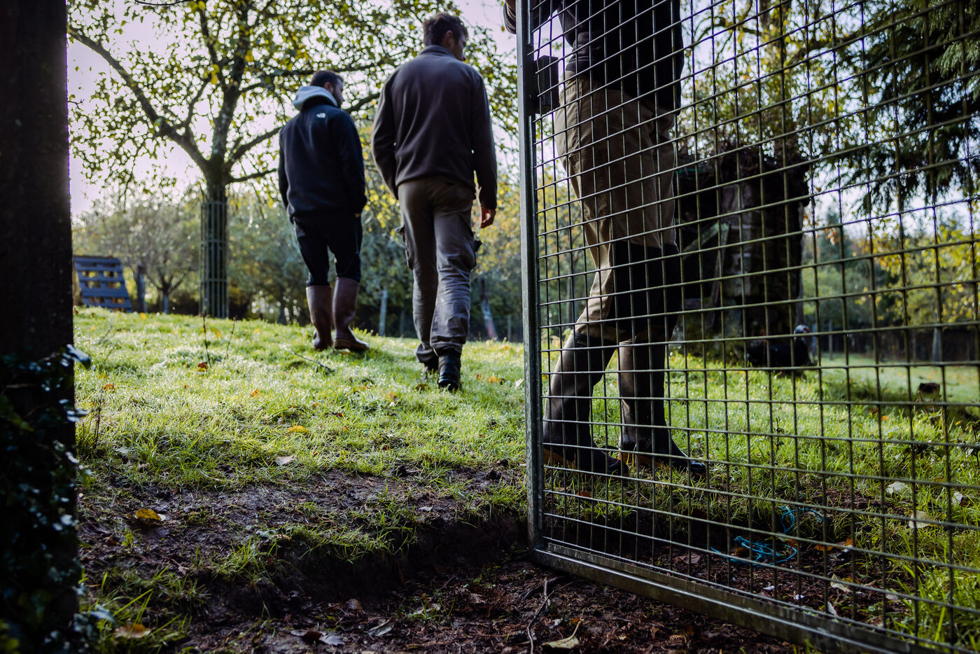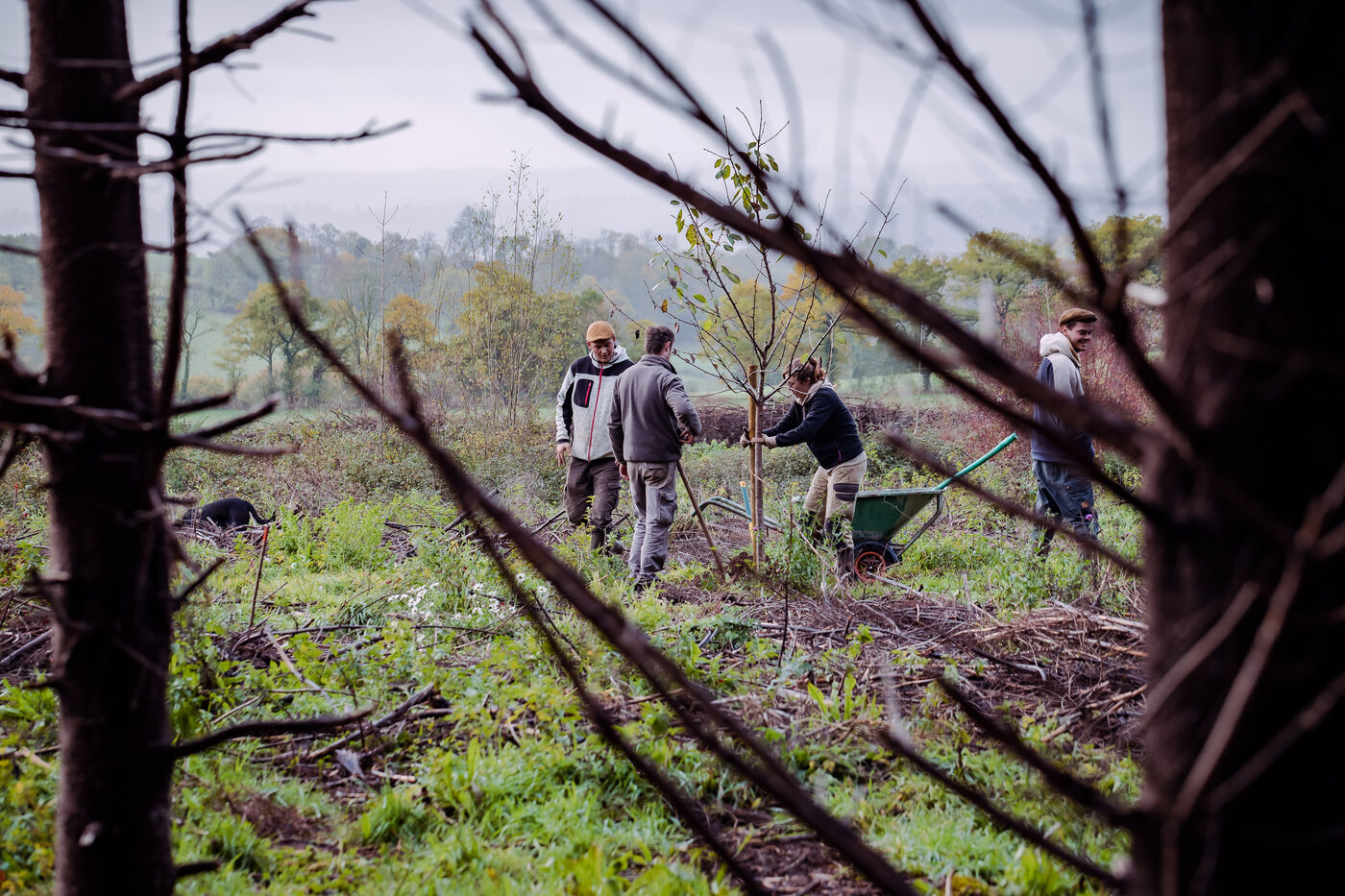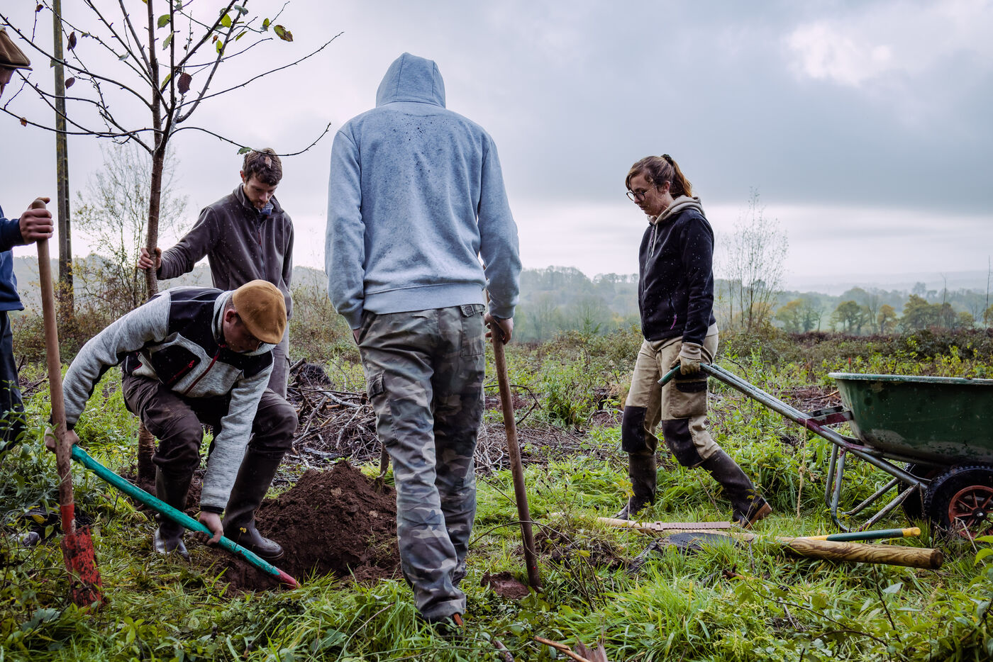 La ferme du Vieux Douet dans le bocage normand est un projet développé par Baptiste et Adèle. Tout deux sont des nouveaux arrivants dans le secteur de l'agriculture. En attendant l'ouverture de leur ferme pédagogique au public, ils agrandissent le verger et préparent l'arrivée d'un poulailler mobile. A Condé-en-Normandie le 25 Novembre 2022.