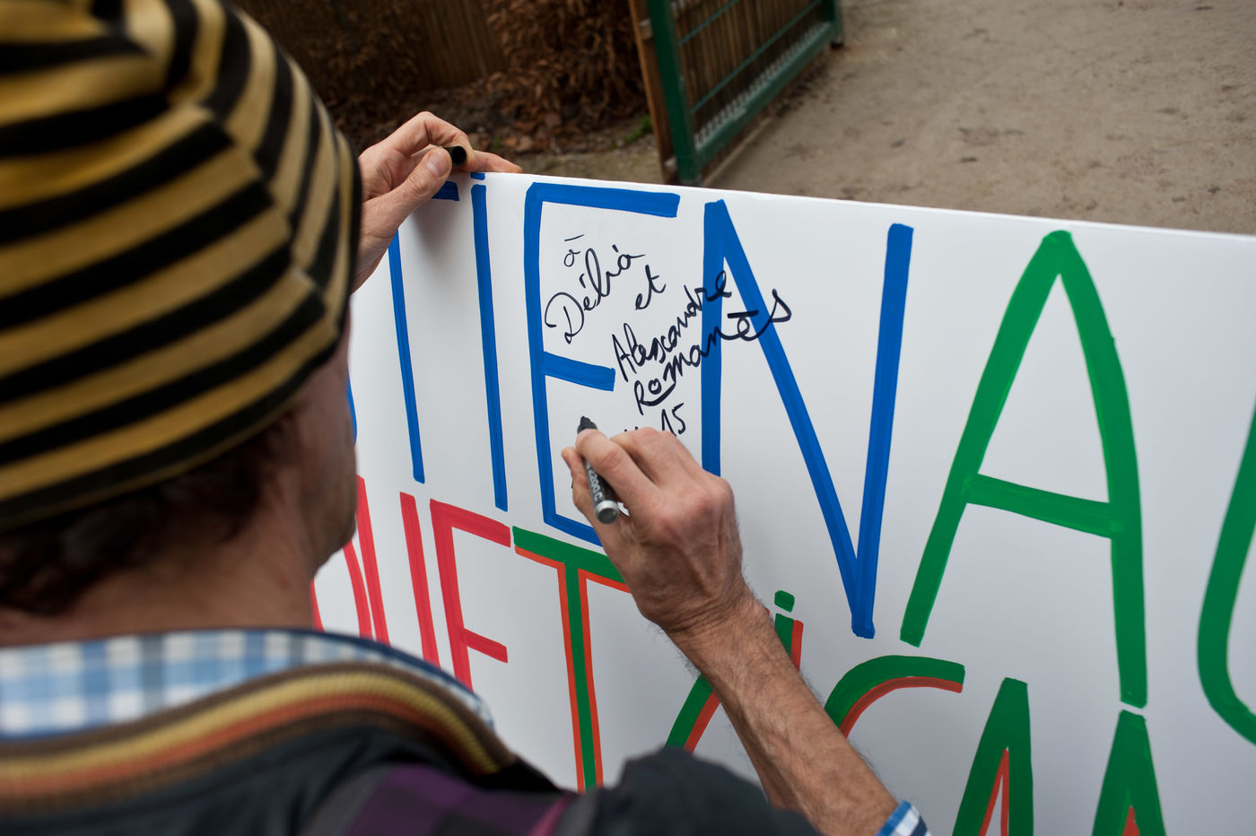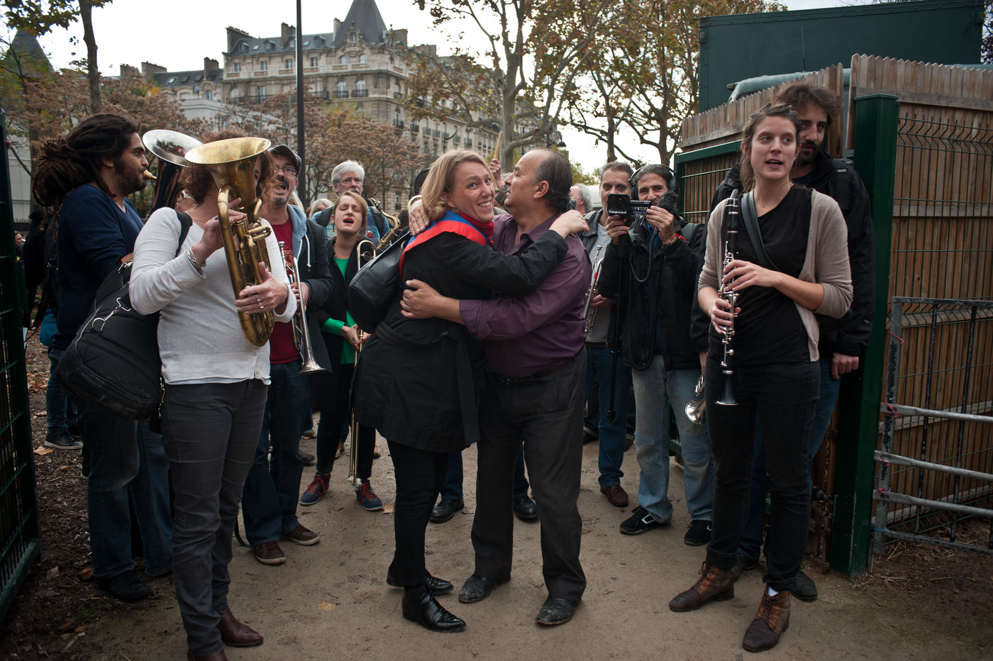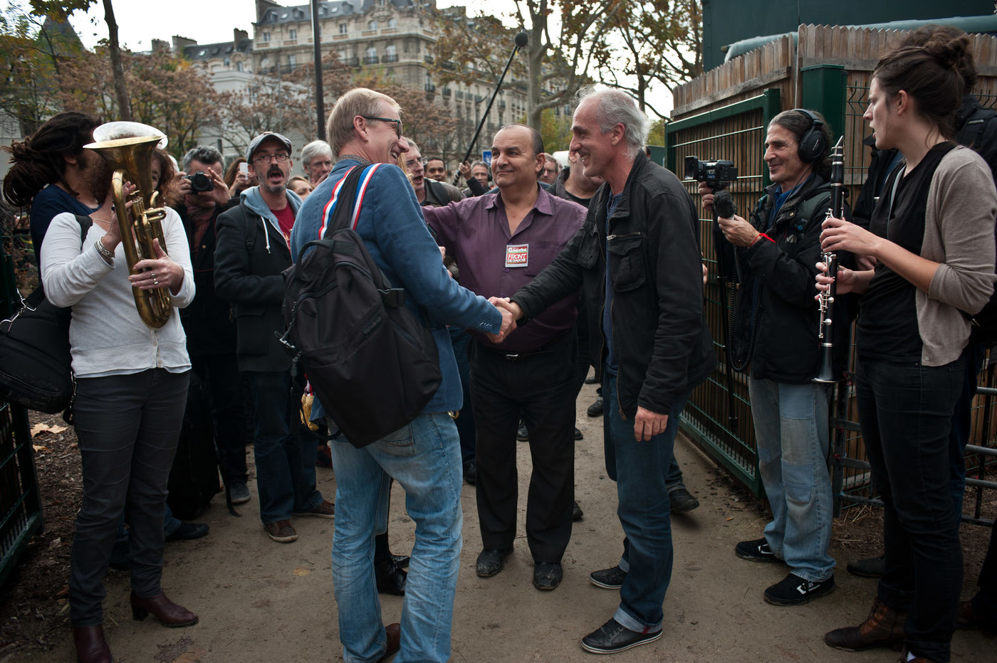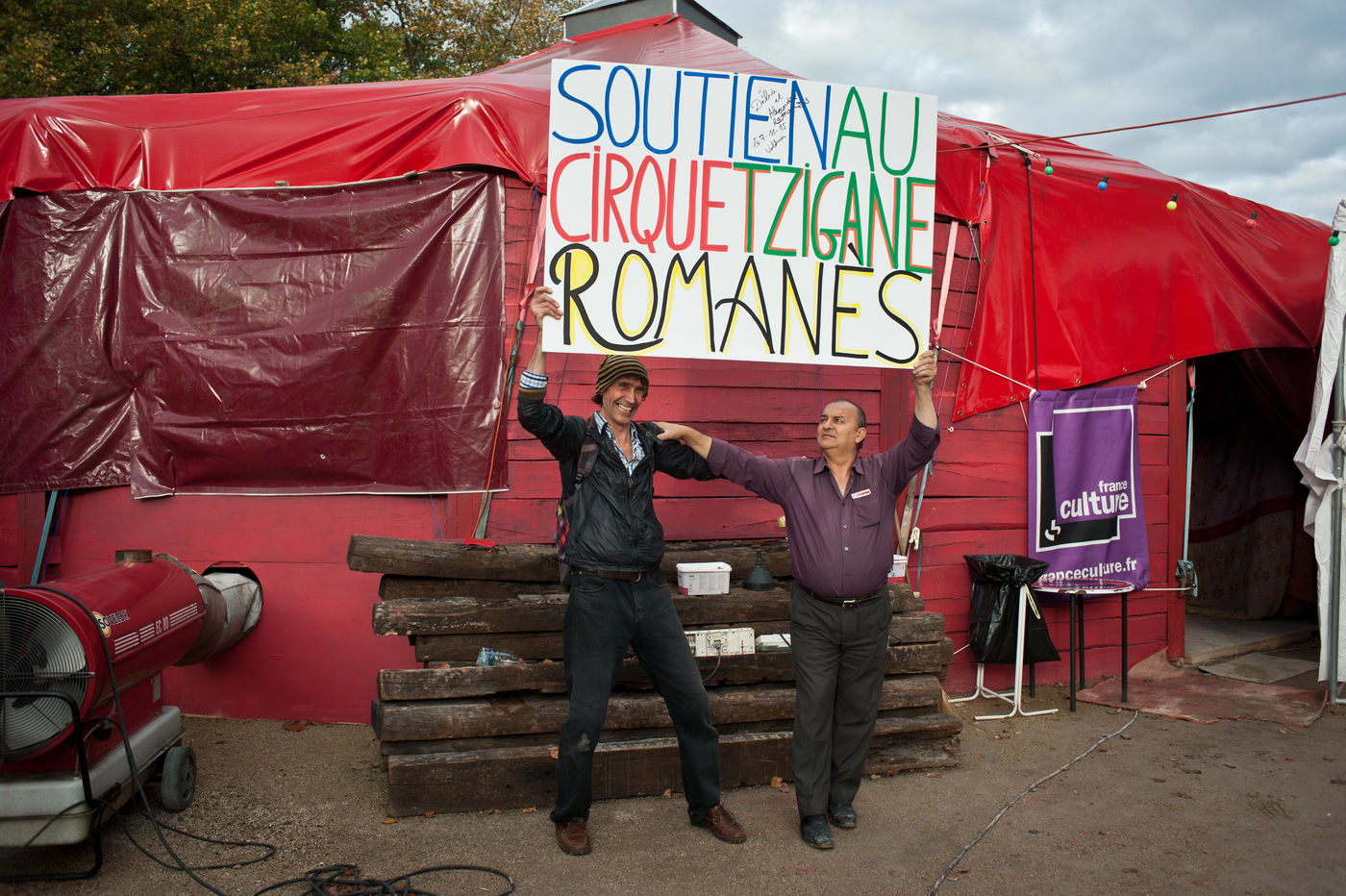 7 novembre 2015 - Manifestation de soutien au cirque Romanes pendant qu'à quelques rues le parti d'extreme droite du parti " souverainté independance et liberté " SIEL rassemblé devant l'ambassade de Hongrie en soutien au Président Viktor Orban pour sa politique contre l'émigration