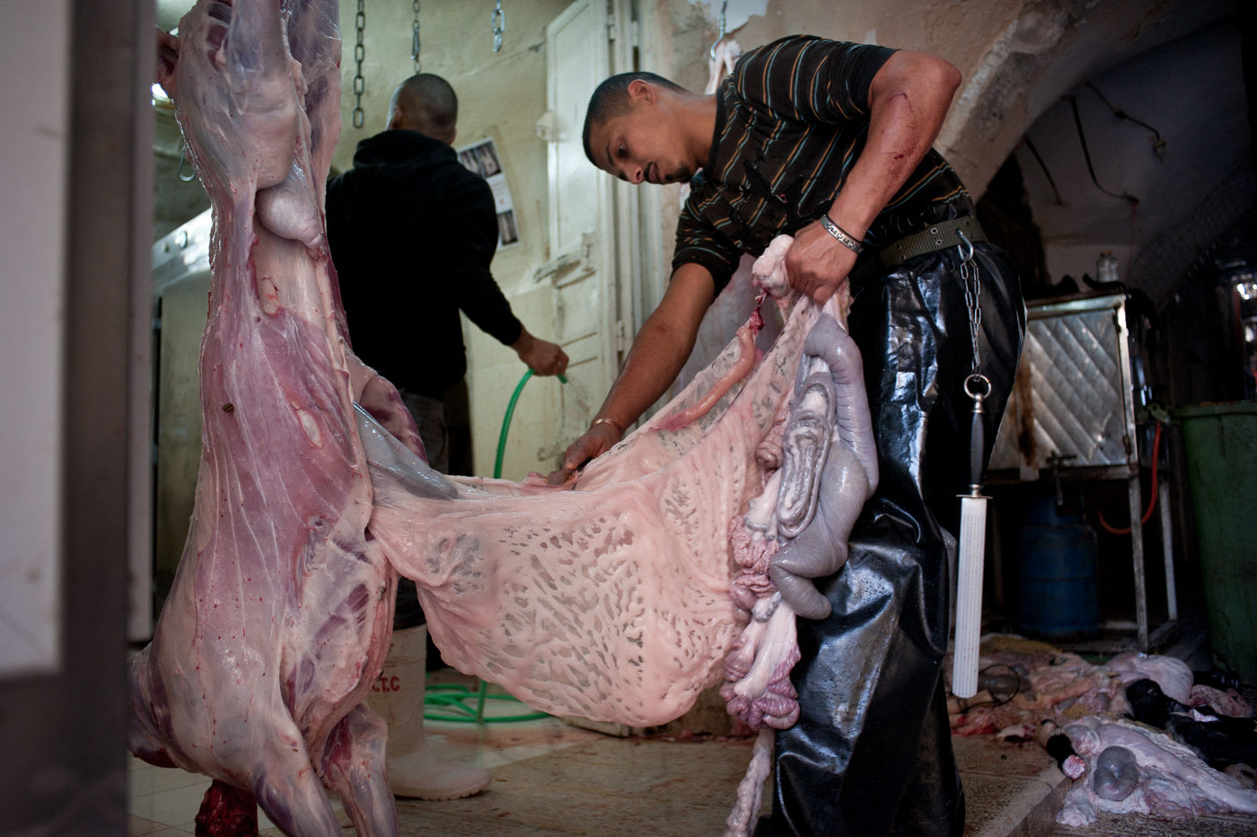 15 octobre 2013-Naplouse en Palestine- Territoires occupés--Pendant de la fête de l'Aïd el kébir. Dans une boucherie de Naplouse le seul commerce ouvert ce jour là. Sacrifice de moutons. Les clients ont achetés leur animal sur pied et repartent avec la viande découpée.