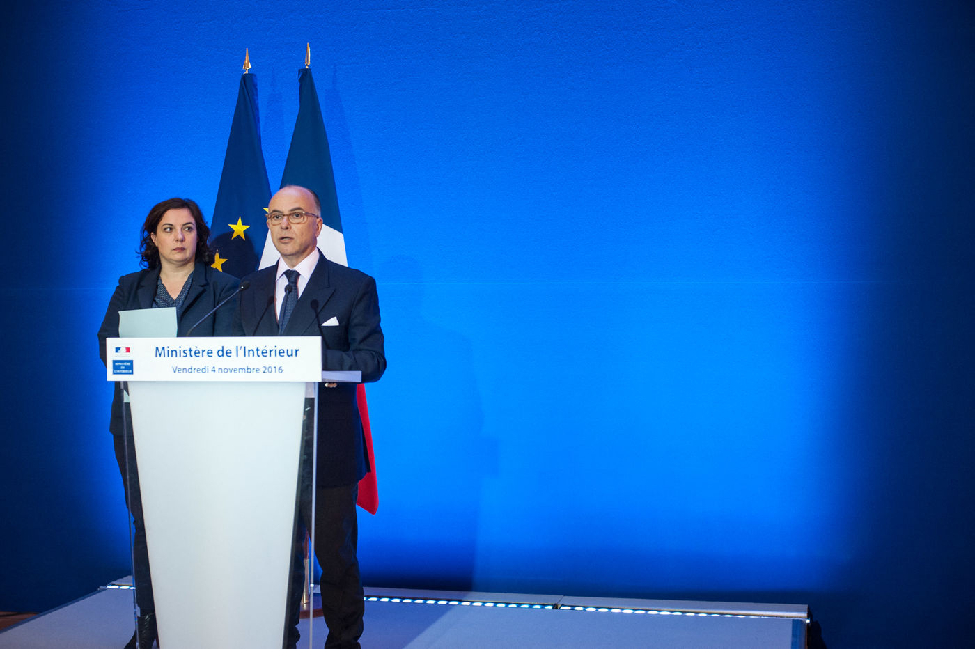 4 novembre 2016 paris, ministère de l'intérieur. Conférence de presse commune de Emmanuelle Cosse et Bernard Cazeneuve sur le démantèlement de la lande de Calais ( jungle ) en cours. Les réfugiés pris en charge sont logés en différents lieux répartis en France.
