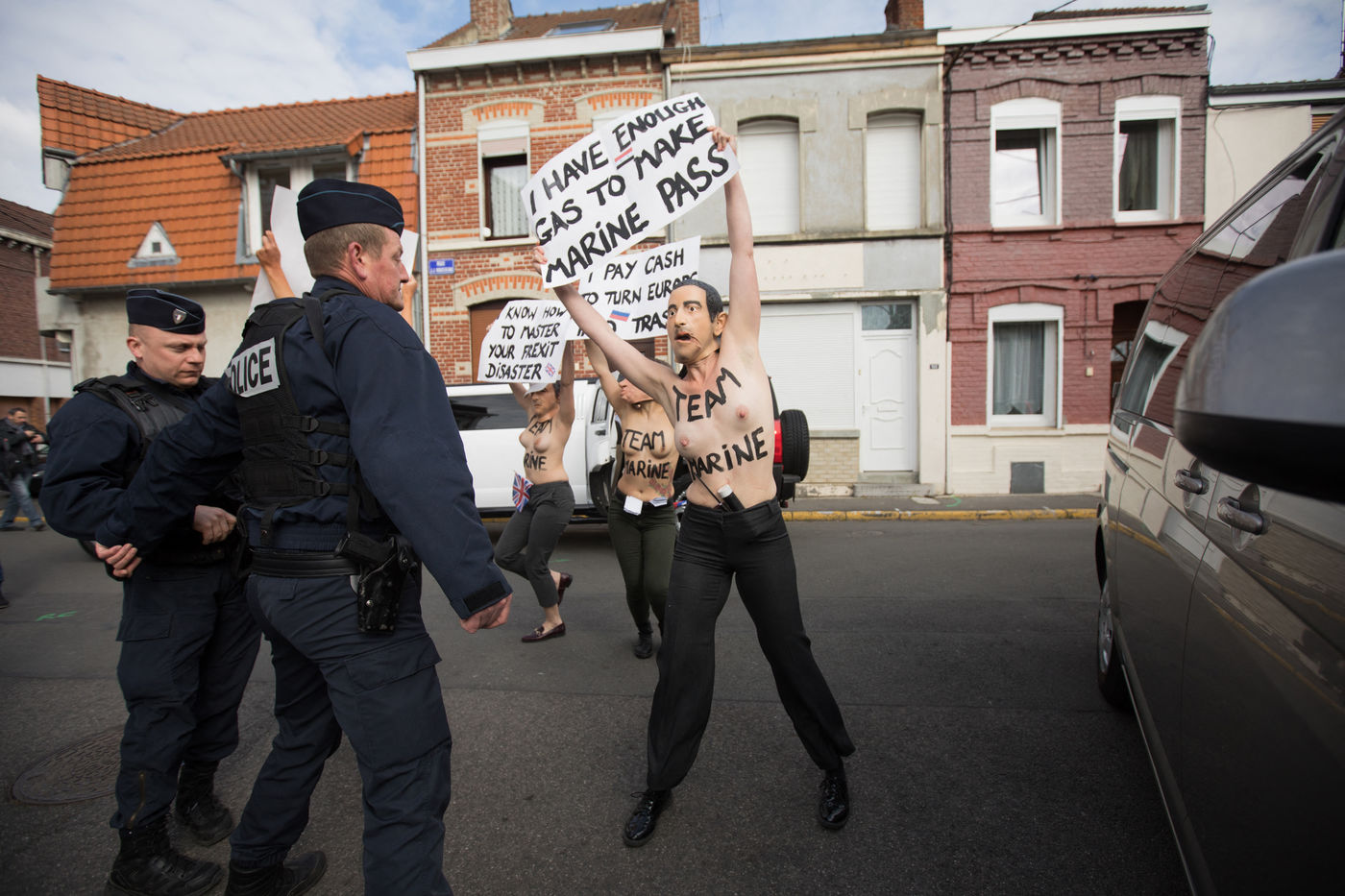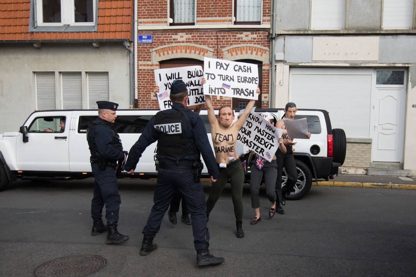 À 10h19, je réalise un cliché de lui en contre-champ, puis je vois sortir d'une limousine des militantes Femen affublées de masques. Je détourne donc mon appareil vers elles, comme d'autres confrères.