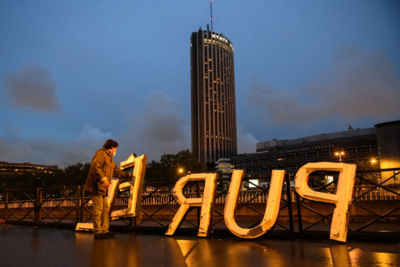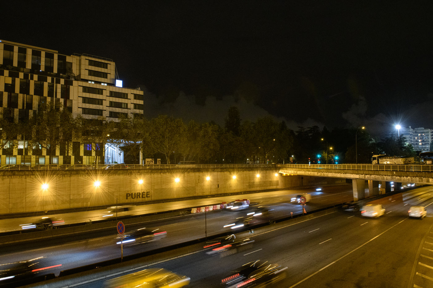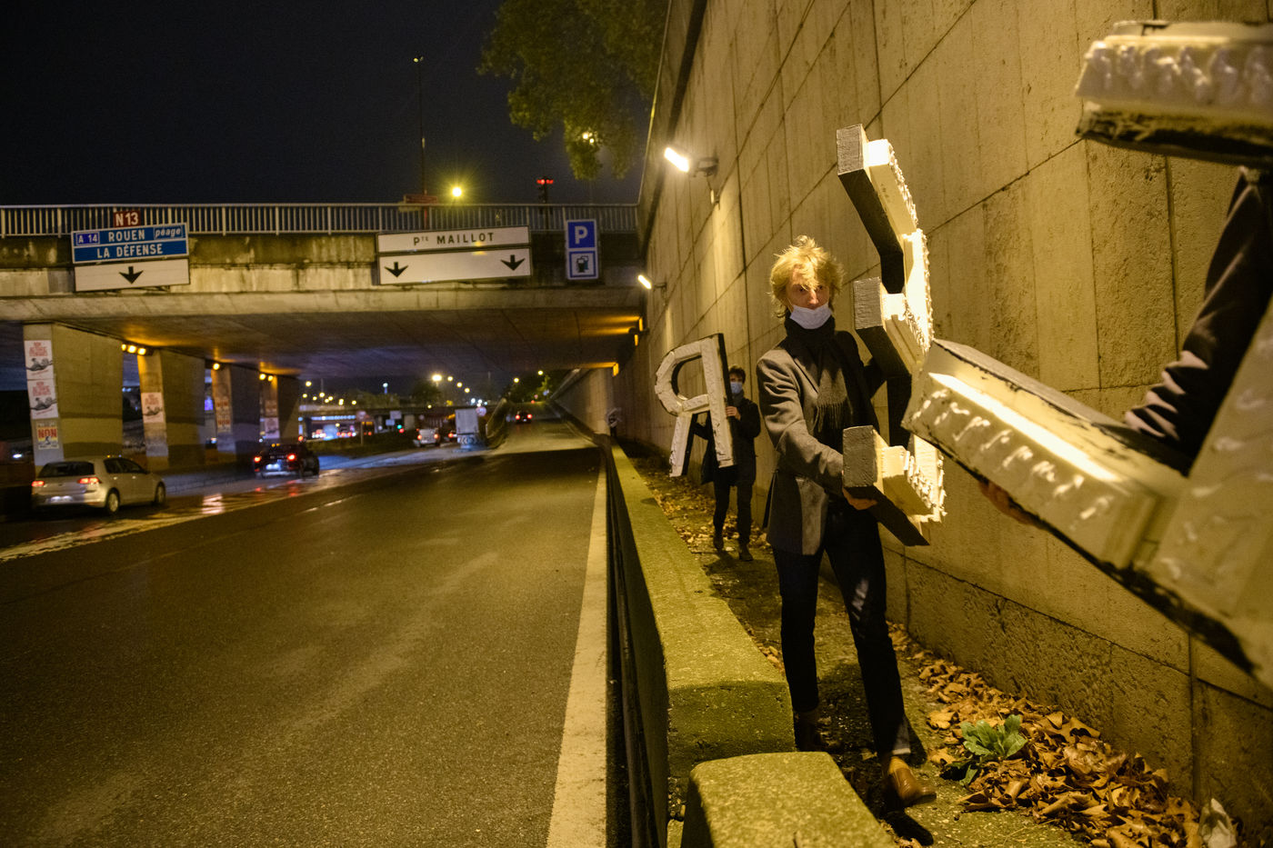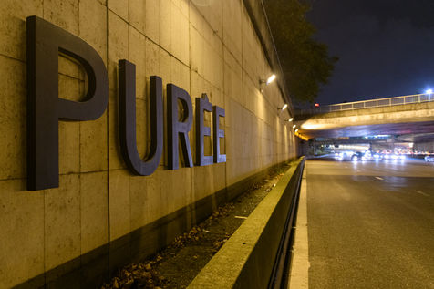 Olivier Urman, French artist has installed an artwork on the Parisian ring road as part of the Nuit Blanche 2021. It is composed of 5 letters d 1m20 high by 5m long forming the word PUREE, Paris, October 2, 2020.