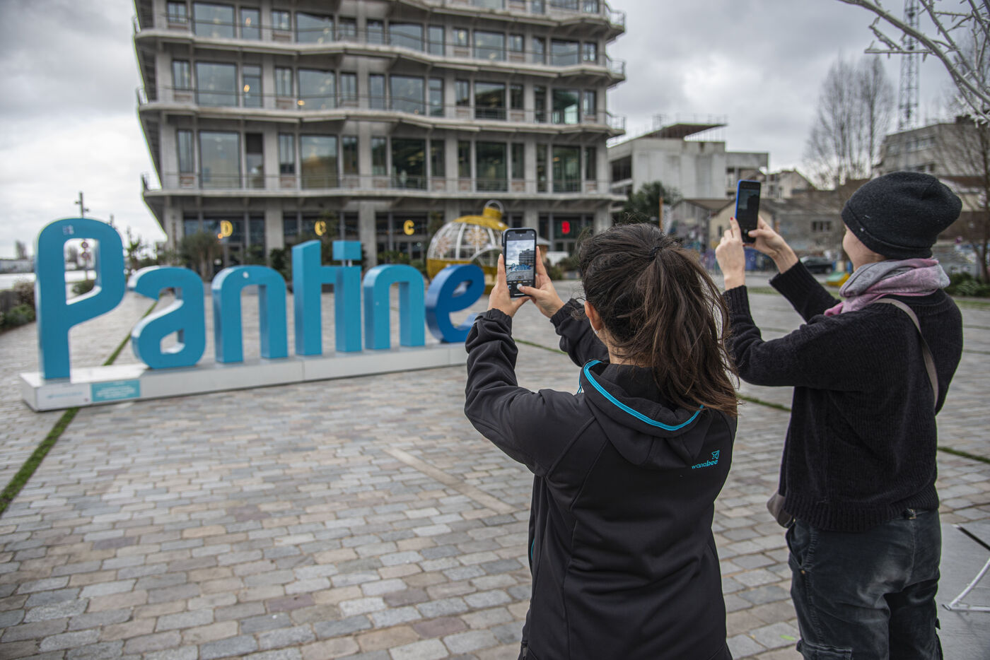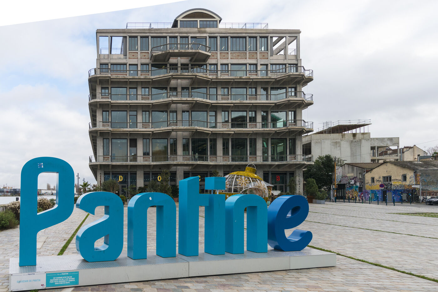 Le long du canal de l'Ourcq, les lettres géantes formant le nom "Pantin" installées place de la Pointe ont reçu un E supplémentaire.