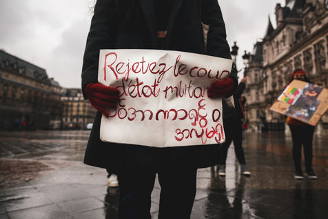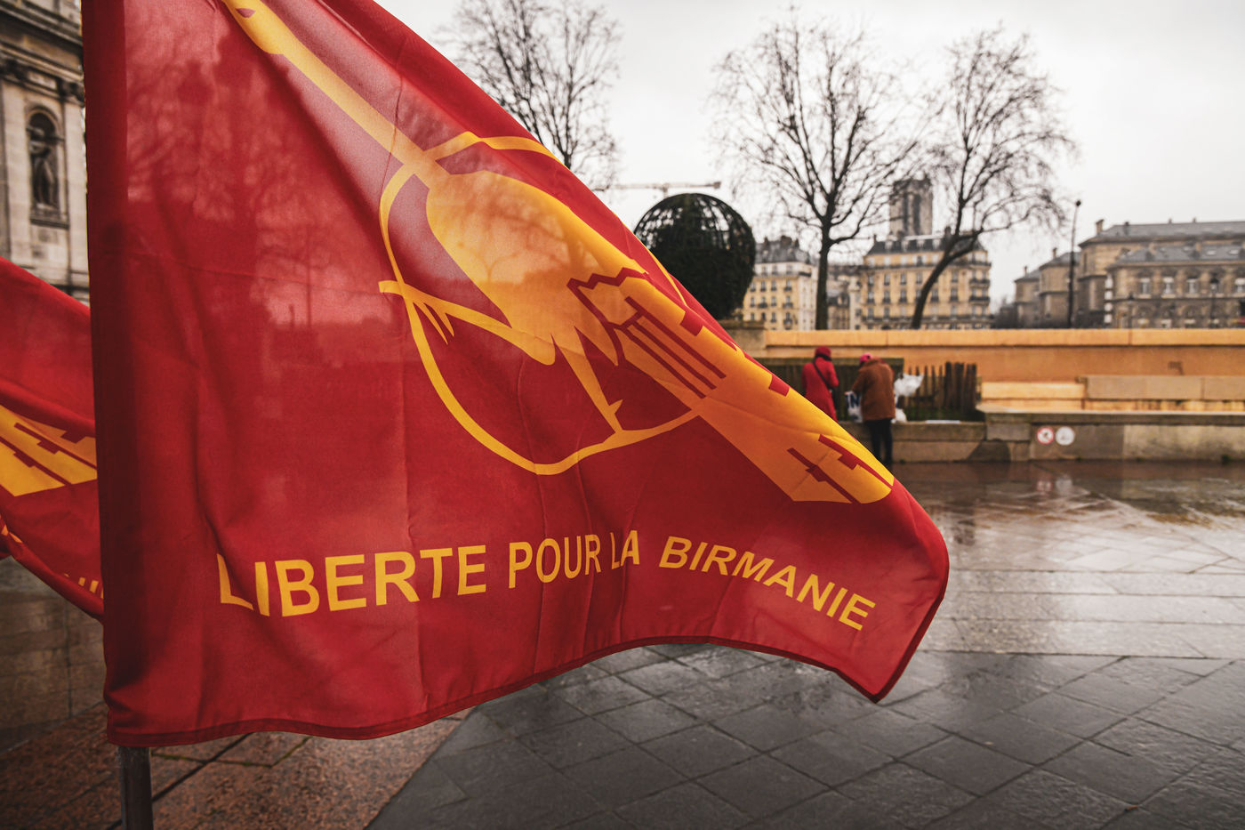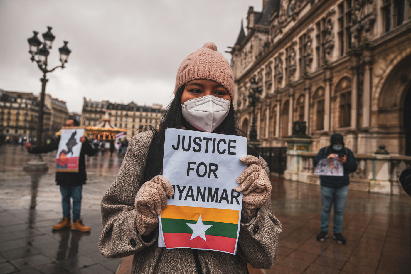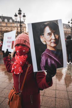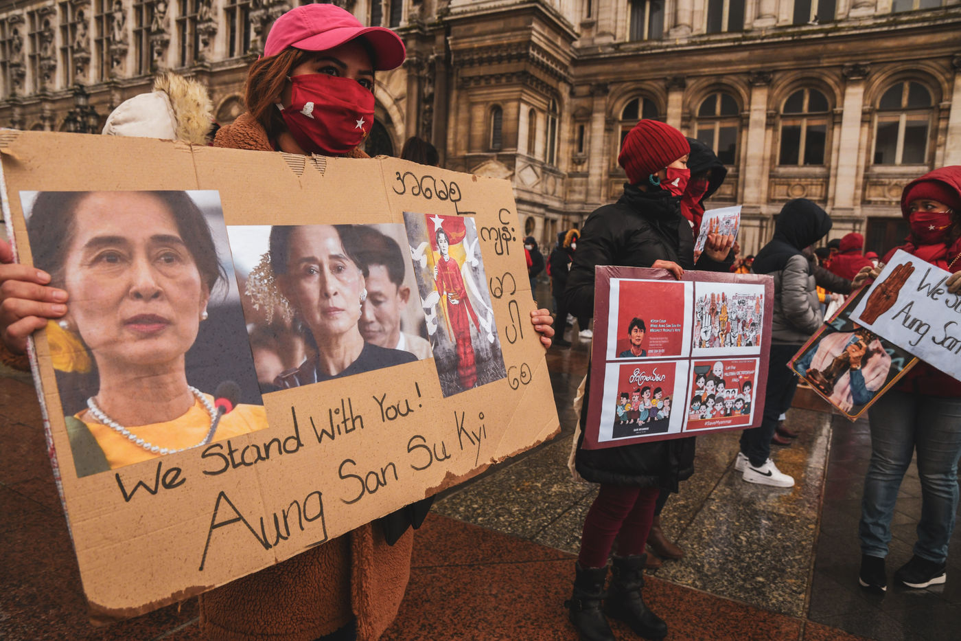 Rassemblement sur la place de l'hôtel de ville de Paris contre le coup d'état de l'armée et l'arrestation et l'assignation à résidence de l'ex-dissidente birmane Aung San Suu Kyi devenue première ministre depuis 2016.
