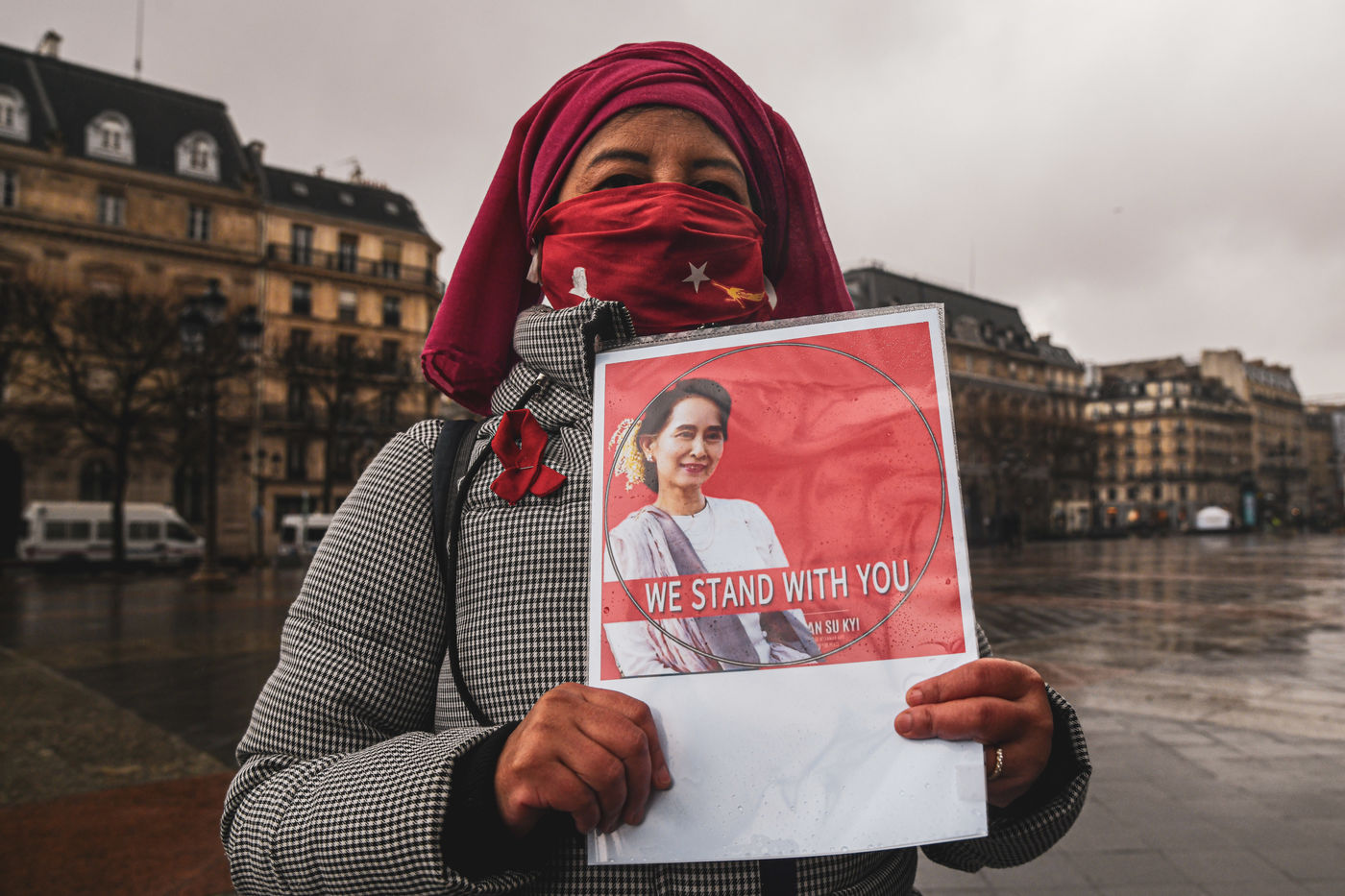 Rally in the town hall square in Paris against the army coup and the arrest and house arrest of ex-Burmese dissident Aung San Suu Kyi, who became prime minister since 2016.