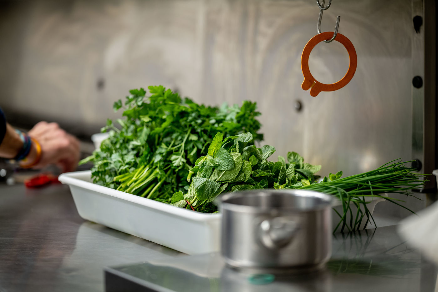 Durant la période de confinement et la crise sanitaire du COVID-19, à l'initiative de l'AP-HP, de Guillaume Gomez, chef des cuisines de l'Elysée et de Stéphane Méjanès, journaliste culinaire, les chefs cuisinent pour les soignants. L'opération est coordonnée bénévolement par la société TipToque, spécialisée dans la livraison de repas aux entreprises. Les produits bruts sont gracieusement offerts par le Marché de Rungis, ainsi que les grossistes Avigros, METRO et Transgourmet. Préparation des repas dans le restaurant L'Agapé, Paris.