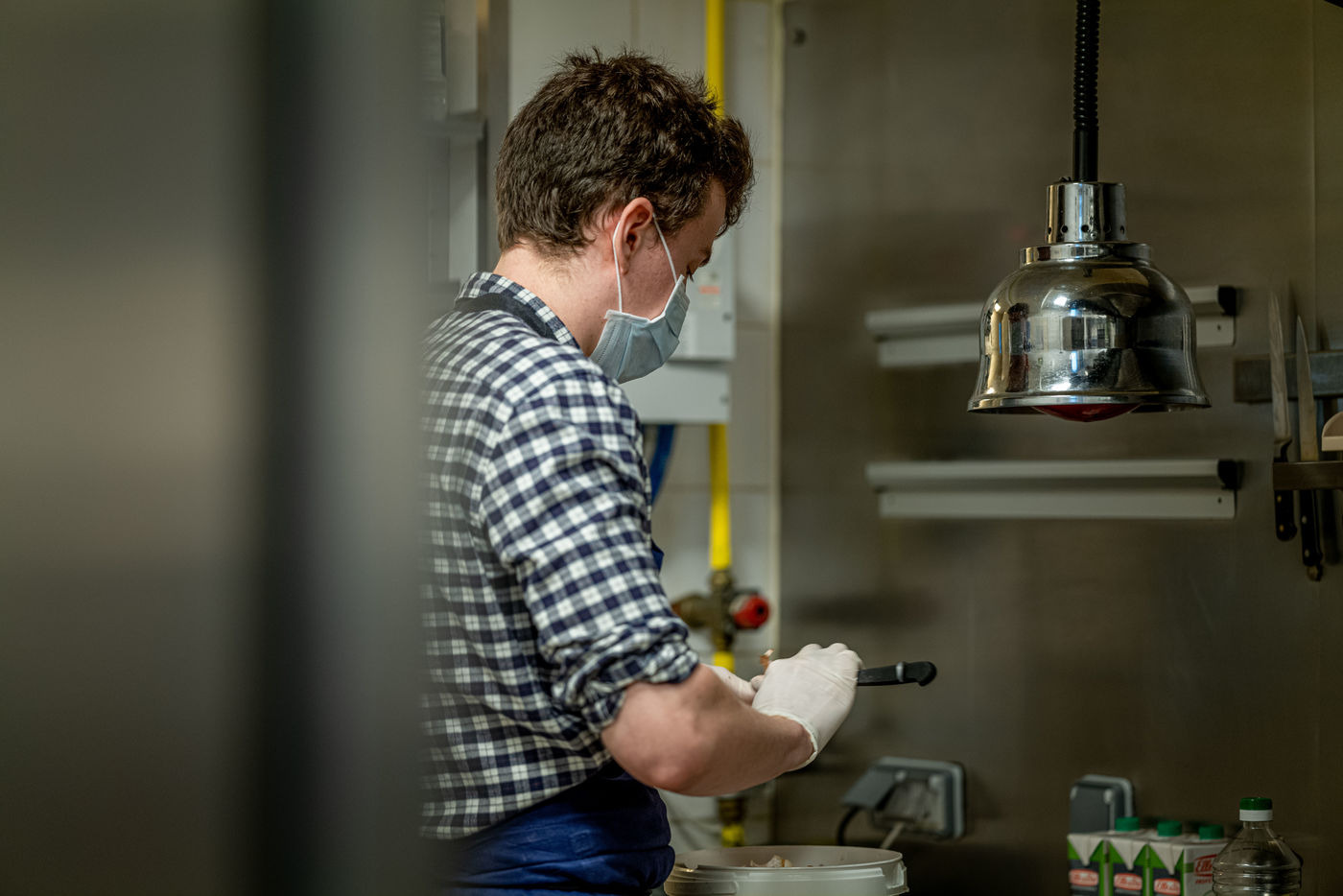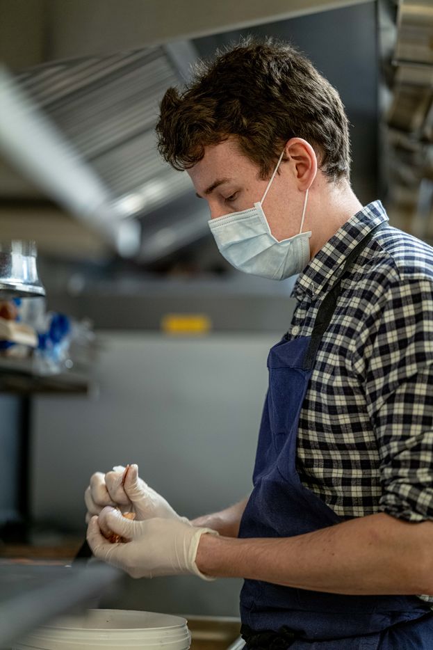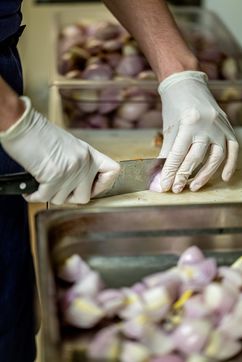 During the period of confinement and the health crisis at COVID-19, at the initiative of the AP-HP, Guillaume Gomez, chef of the Elysée kitchens and Stéphane Méjanès, culinary journalist, the chefs cooked for the caregivers. The operation is coordinated on a voluntary basis by the company TipToque, which specializes in delivering meals to businesses. The raw products are donated by Rungis Market, as well as the wholesalers Avigros, METRO and Transgourmet. Meal preparation in the Le Mermoz restaurant, Paris.