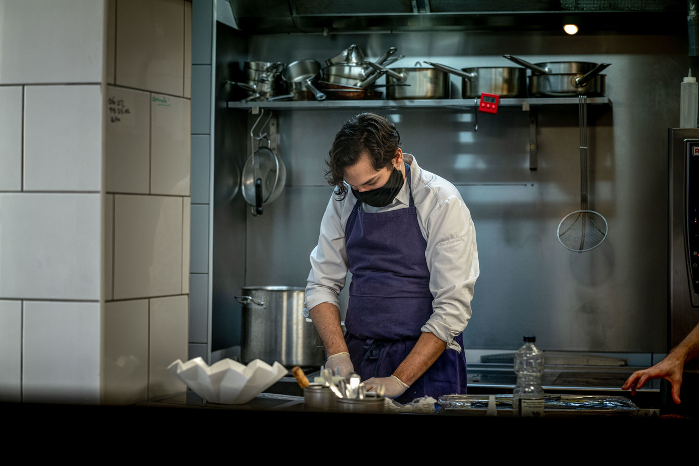 Durant la période de confinement et la crise sanitaire du COVID-19, à l'initiative de l'AP-HP, de Guillaume Gomez, chef des cuisines de l'Elysée et de Stéphane Méjanès, journaliste culinaire, les chefs cuisinent pour les soignants. L'opération est coordonnée bénévolement par la société TipToque, spécialisée dans la livraison de repas aux entreprises. Les produits bruts sont gracieusement offerts par le Marché de Rungis, ainsi que les grossistes Avigros, METRO et Transgourmet. Préparation des repas dans le restaurant Pantagruel, Paris.