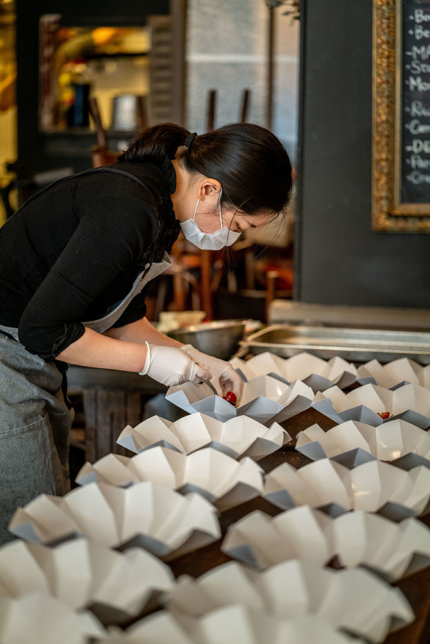 Durant la période de confinement et la crise sanitaire du COVID-19, à l'initiative de l'AP-HP, de Guillaume Gomez, chef des cuisines de l'Elysée et de Stéphane Méjanès, journaliste culinaire, les chefs cuisinent pour les soignants. L'opération est coordonnée bénévolement par la société TipToque, spécialisée dans la livraison de repas aux entreprises. Les produits bruts sont gracieusement offerts par le Marché de Rungis, ainsi que les grossistes Avigros, METRO et Transgourmet. Préparation des repas dans le restaurant Margo, Paris.