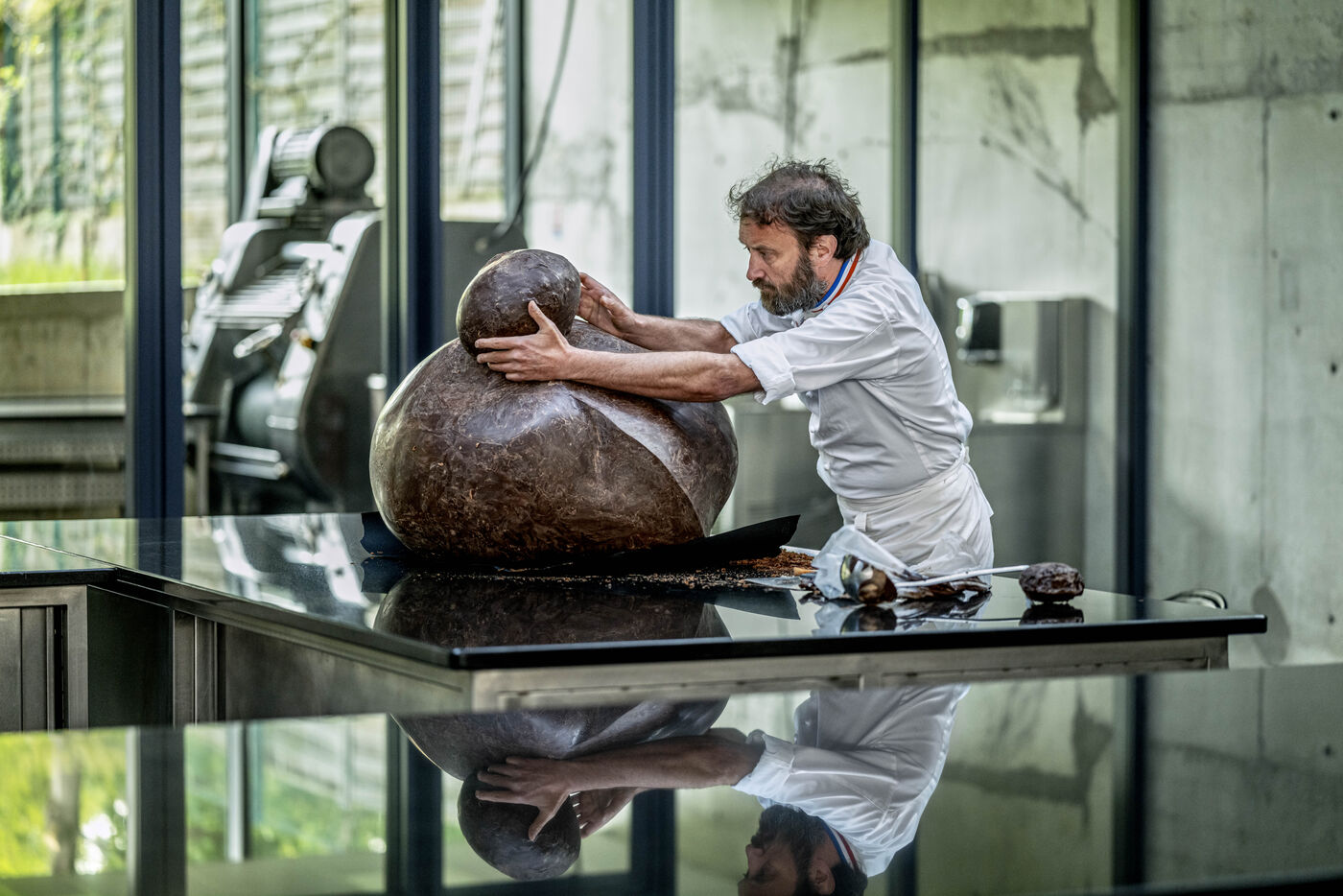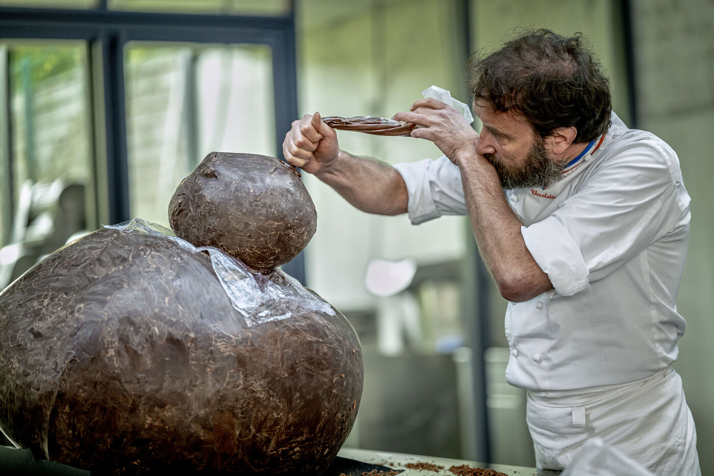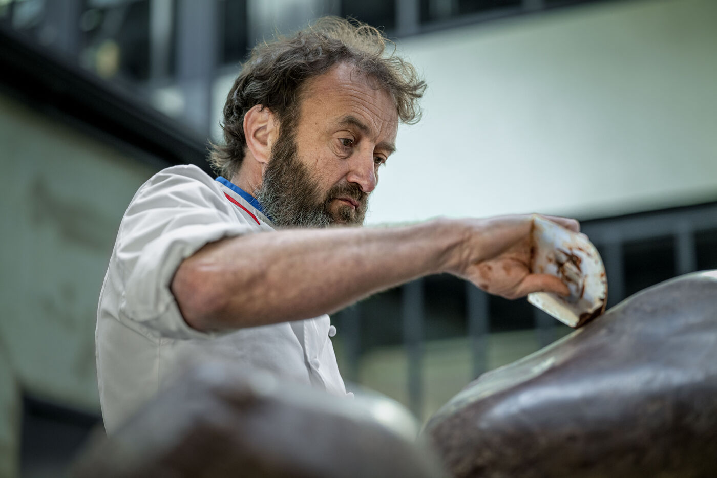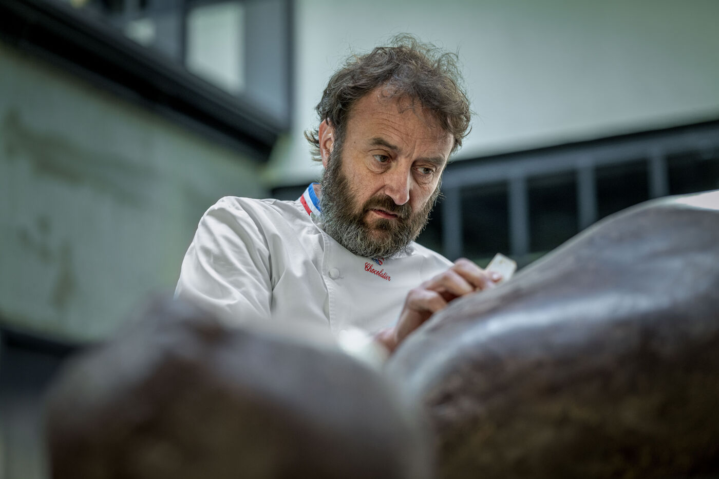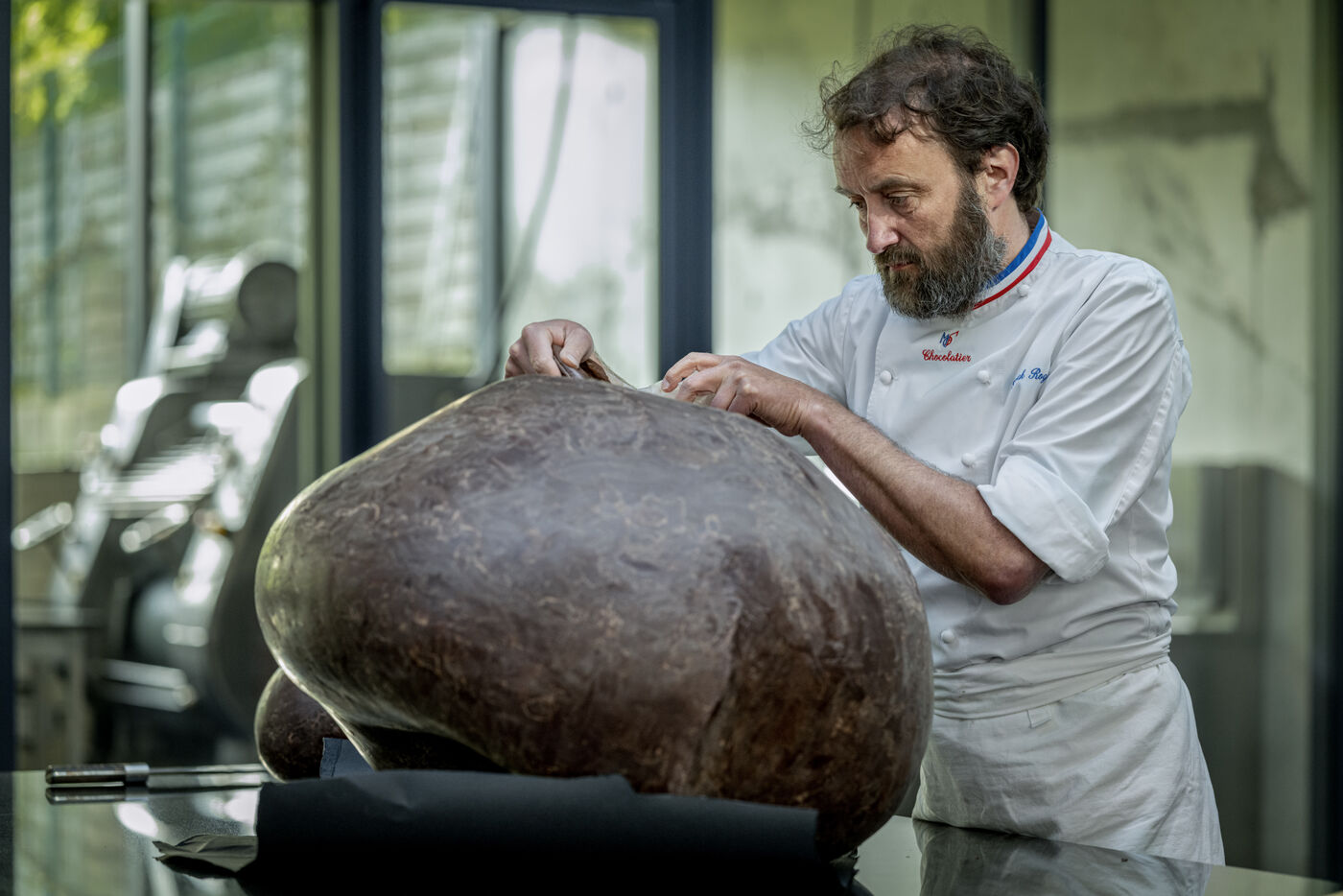 Meeting with Patrick Roger, MOF chocolatier, in his laboratory workshop in Sceaux, to see him sculpting his next creation in chocolate. Know-how, technique, but above all commitment of the body in the service of the material.