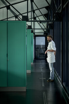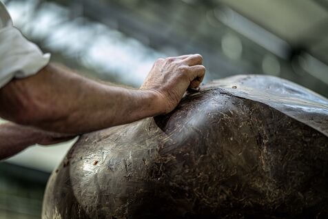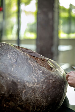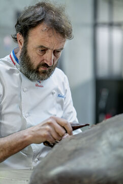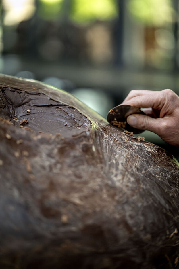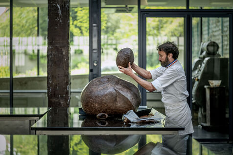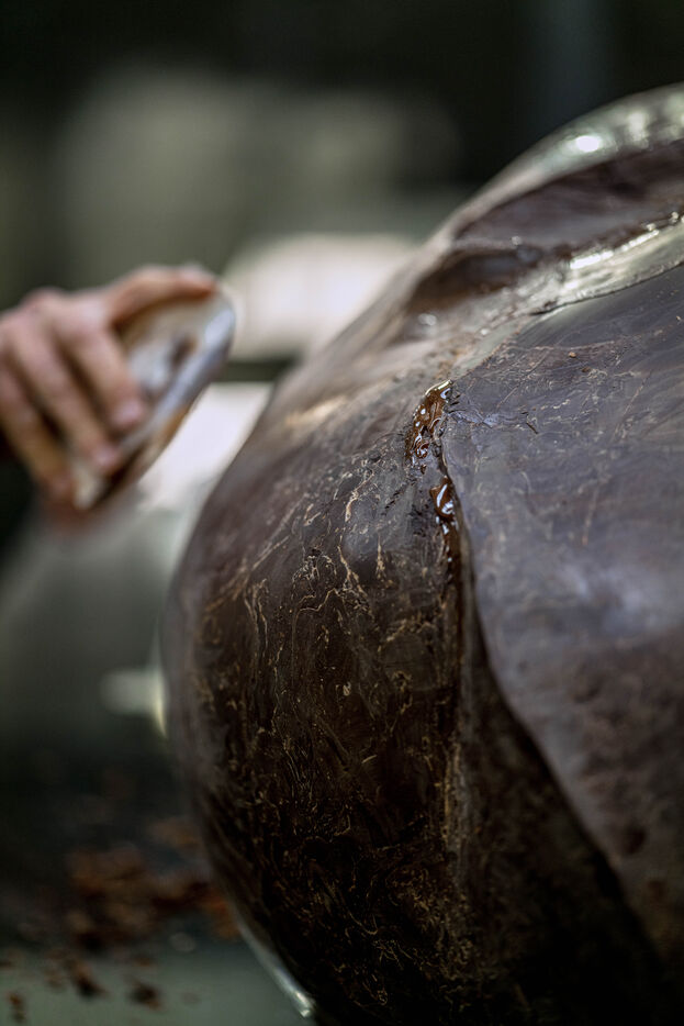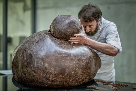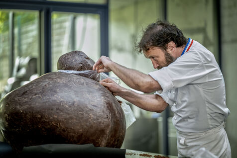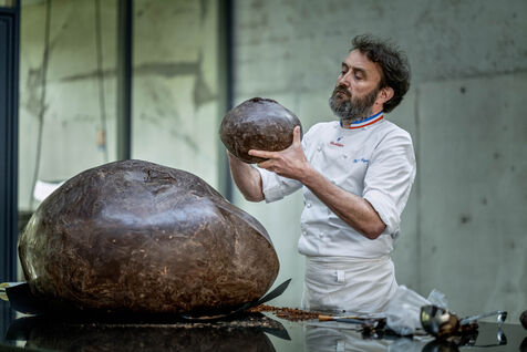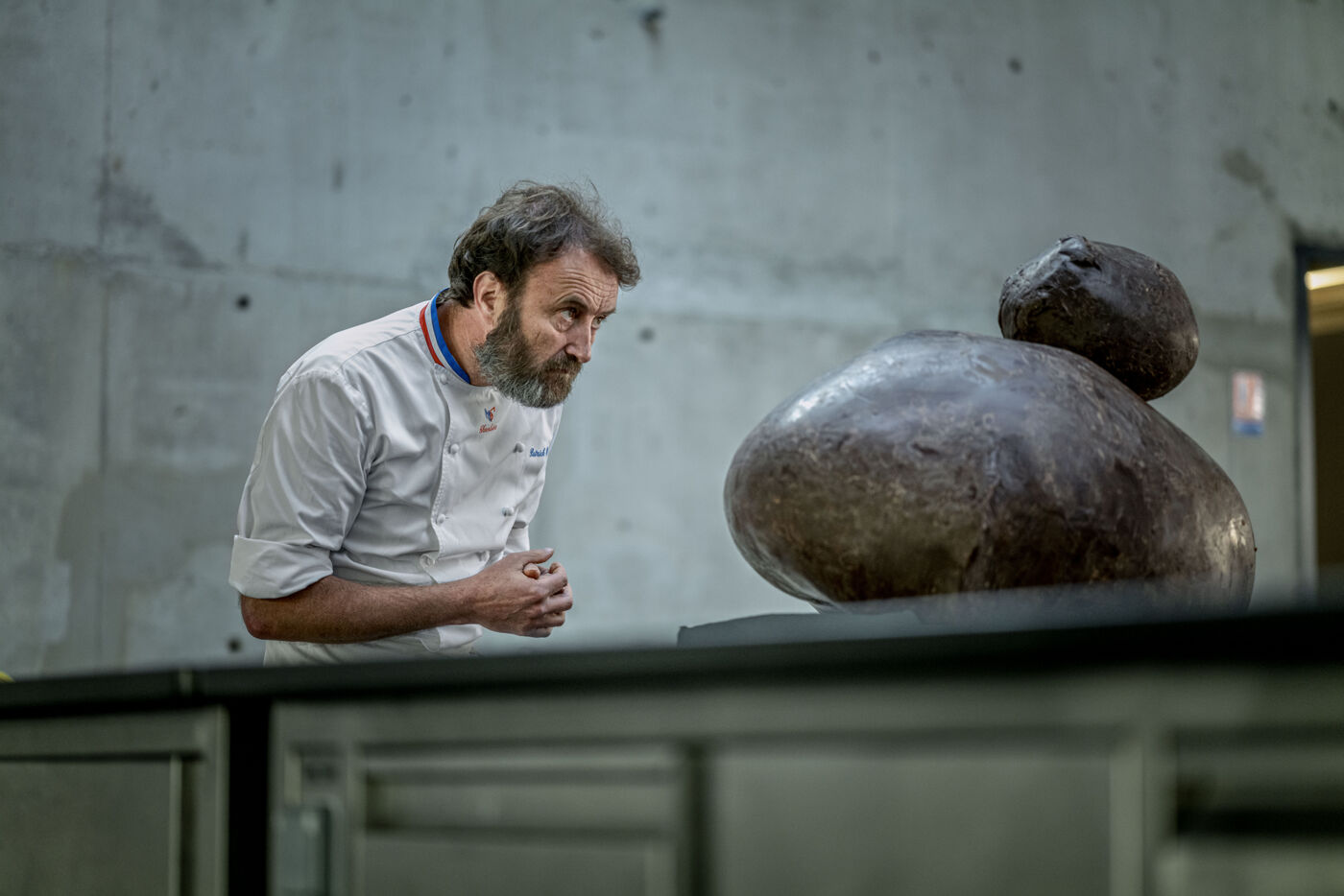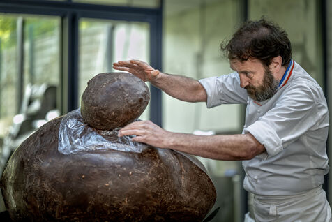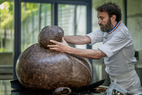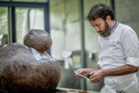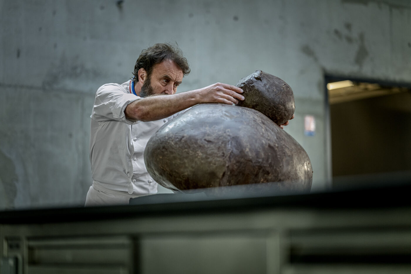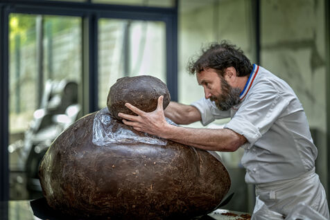 Meeting with Patrick Roger, MOF chocolatier, in his laboratory workshop in Sceaux, to see him sculpting his next creation in chocolate. Know-how, technique, but above all commitment of the body in the service of the material.