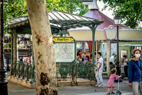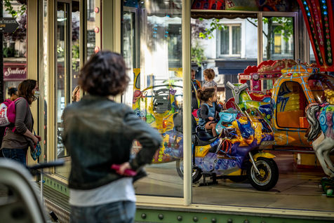 Sunday May 24, 2020, following the COVID-19 health crisis and in the midst of deconfinement, while parks are still forbidden to the public, the Place des Abbesses carousel is open. Posters inform about the rules of distance to be respected, but no cleaning of the merry-go-round between each round.