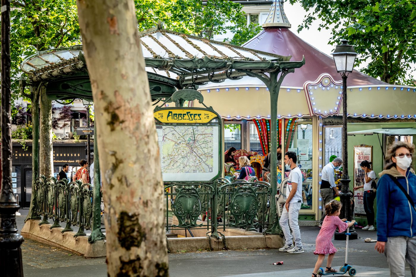 Dimanche 24 Mai 2020, suite à la crise sanitaire du COVID-19 et en pleine phase de déconfinement, alors que les parcs sont toujours interdits au public, le manège de la Place des Abbesses est ouvert. Des affichettes informent des règles de distanciation à respecter, mais pas de nettoyage du manège entre chaque tour.