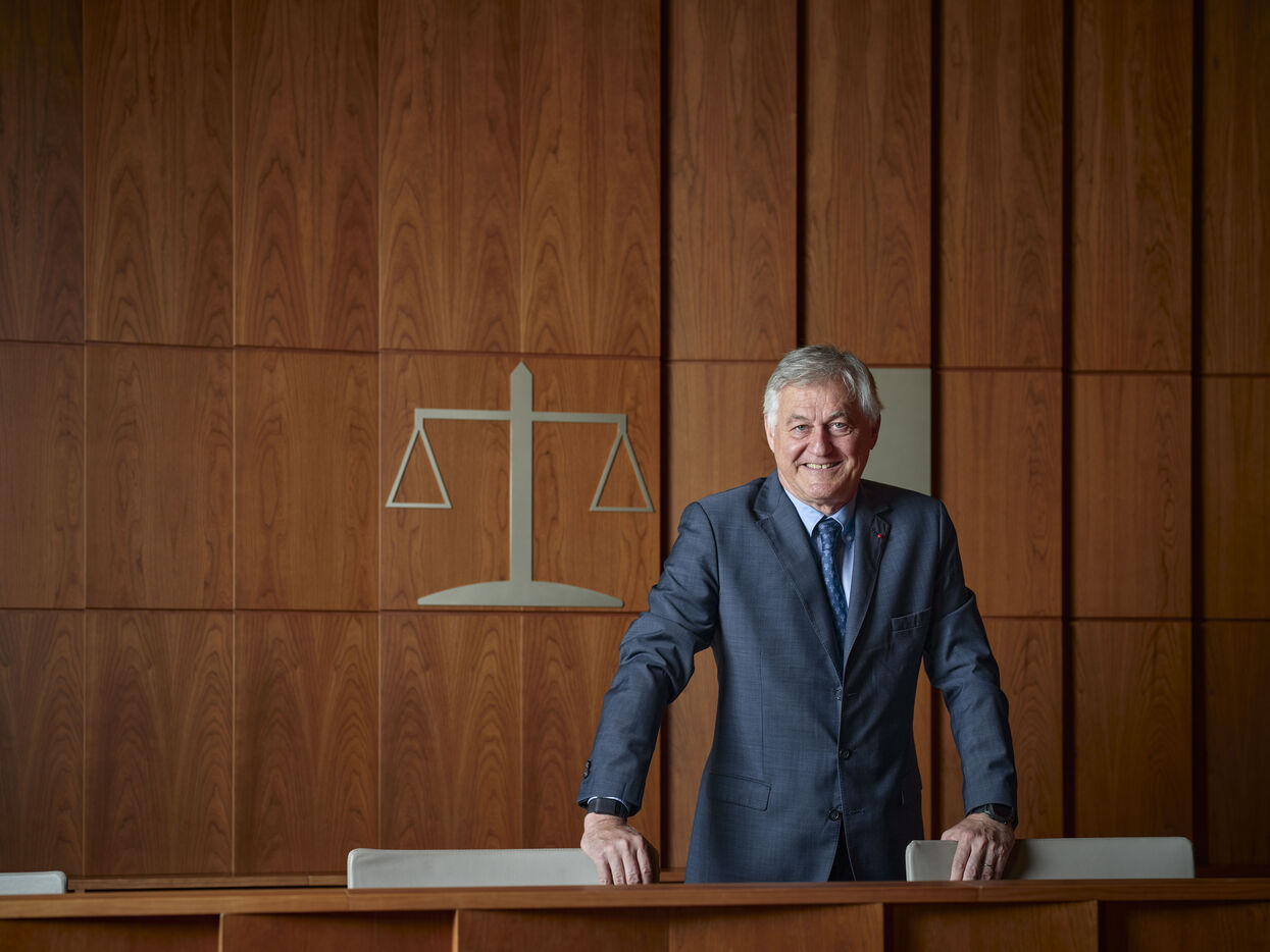 Portraits de Patrick Sayer, président du Tribunal de Commerce de Paris, dans la salle d'audience des litiges internationaux.