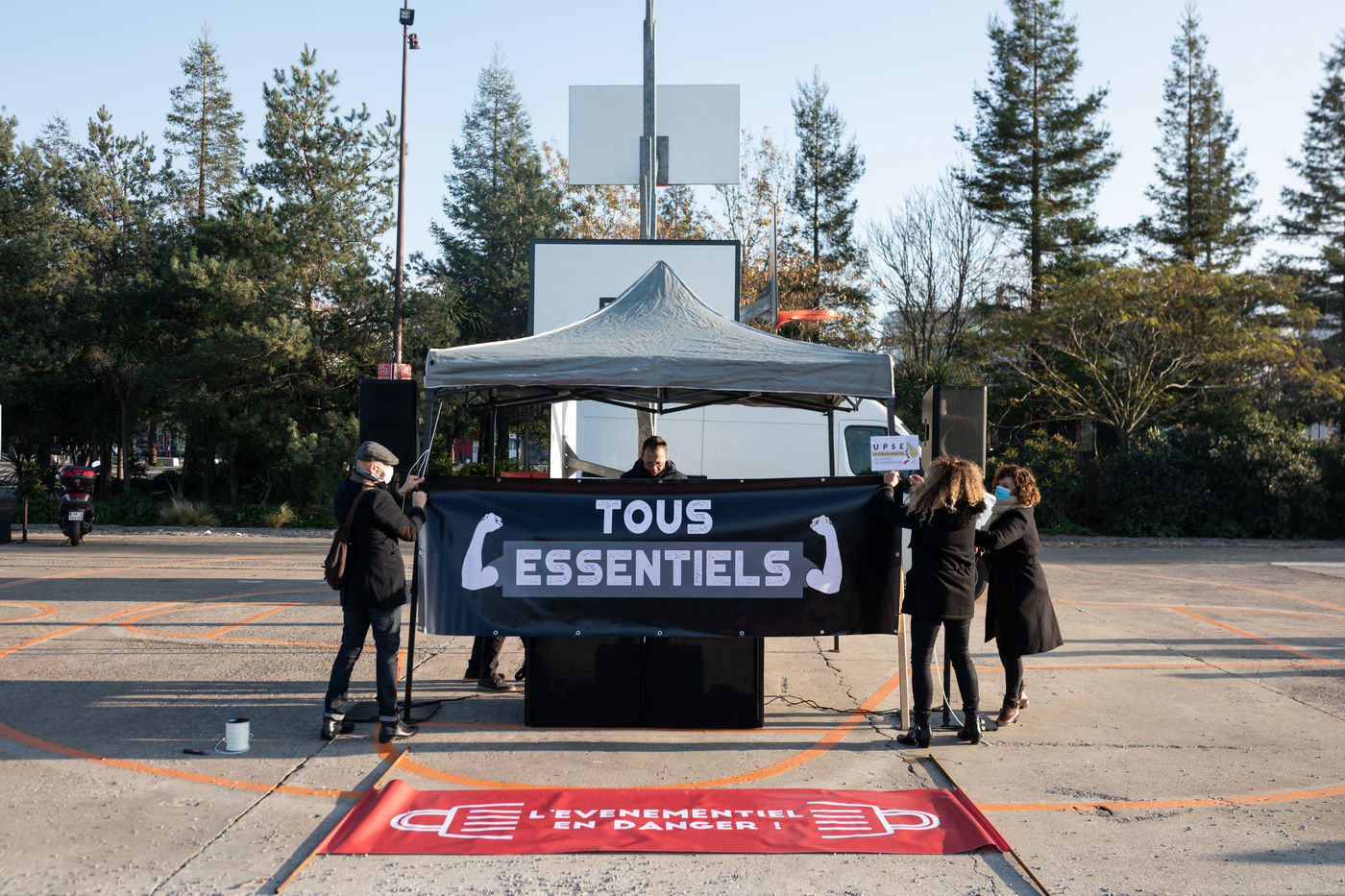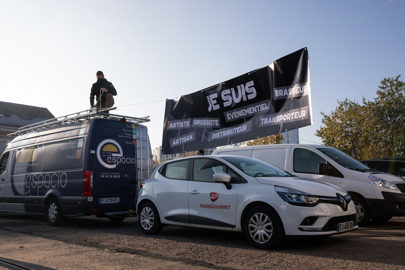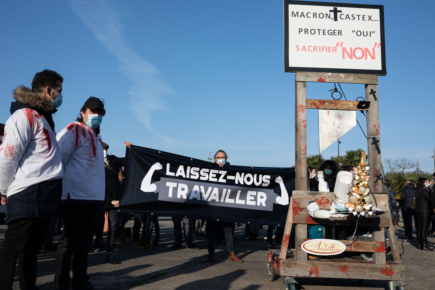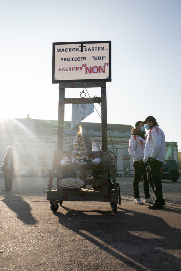 Près de 1000 personnes, professionnelles des secteurs des cafés, hôtels, restaurants, discothèques, traiteurs, réceptions, fournisseurs... se sont rassemblées pour protester contre les mesures prises a leur encontre par le gouvernement dans la gestion de la pandemie de covid-19 alors que certaines entreprises n'ont pu exercer que pendant quelques mois de l'année. Nantes, France - 30 novembre 2020.